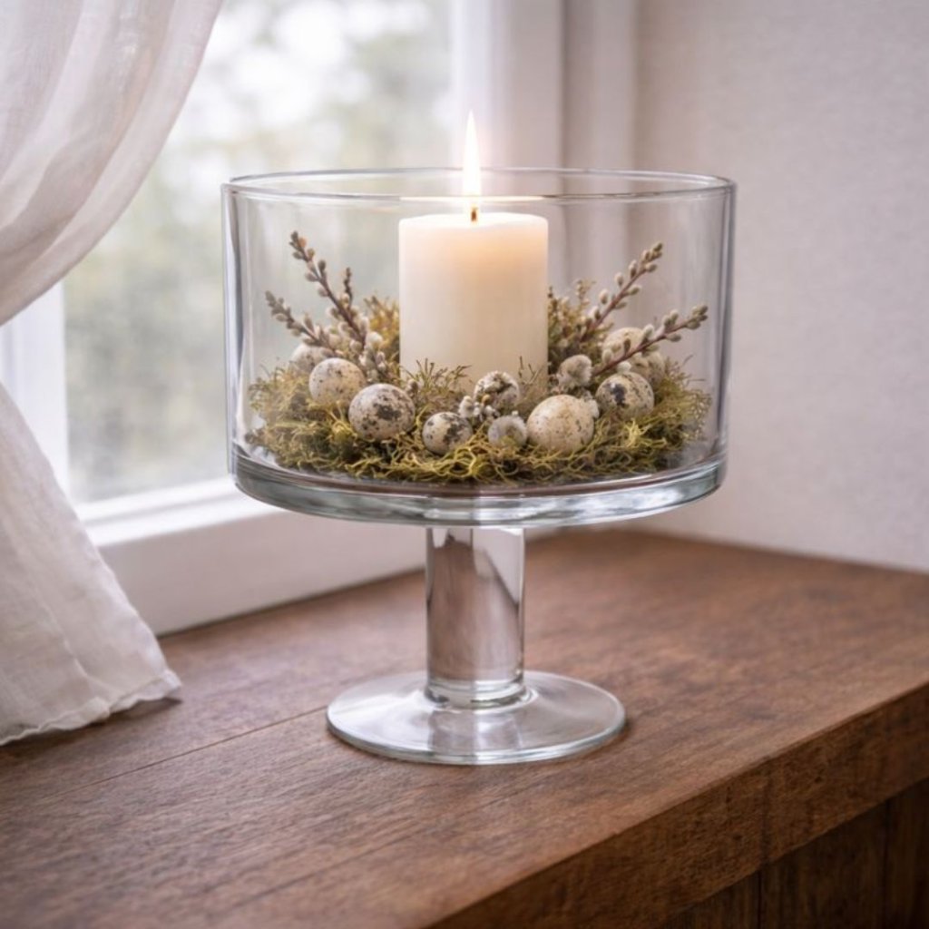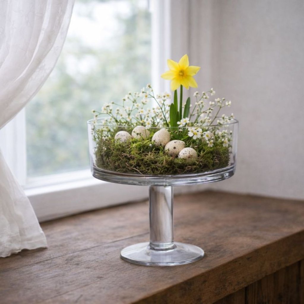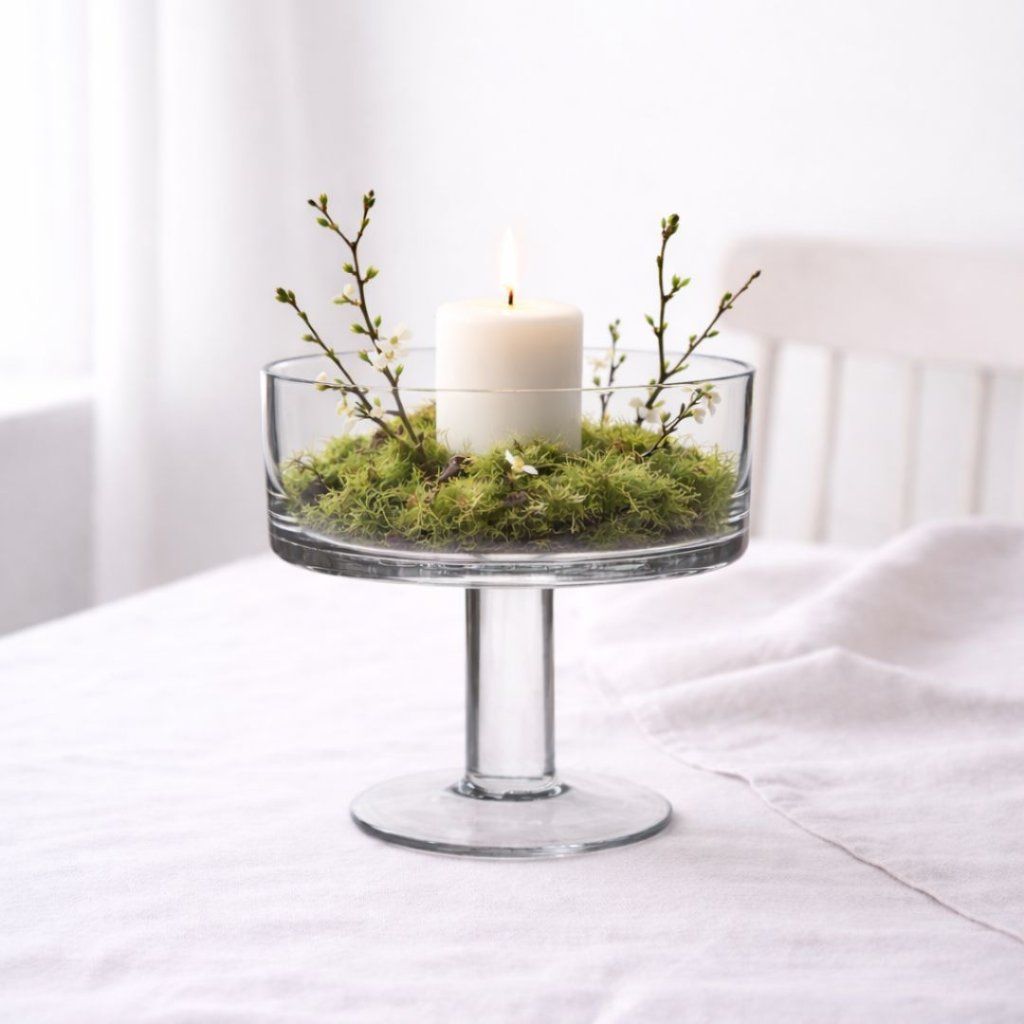 - Skleněná mísa na noze je krásný a nadčasový doplněk, který vynikne sám o sobě i jako součást jemného aranžmá. Skvěle poslouží jako svícen, na sezónní dekorace, sušené květiny nebo drobné přírodniny.