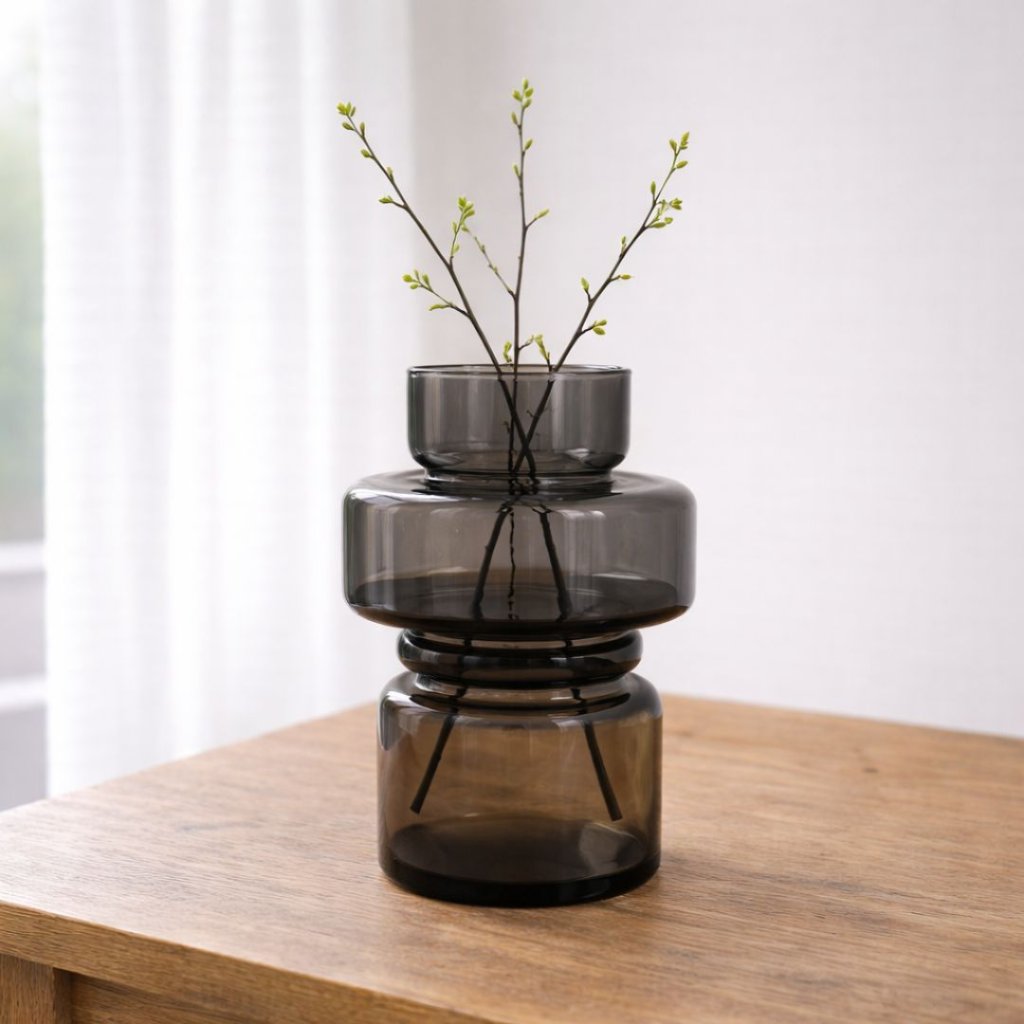 Čistá váza s jemným šedým tónem, která v prostoru působí klidně a přirozeně.