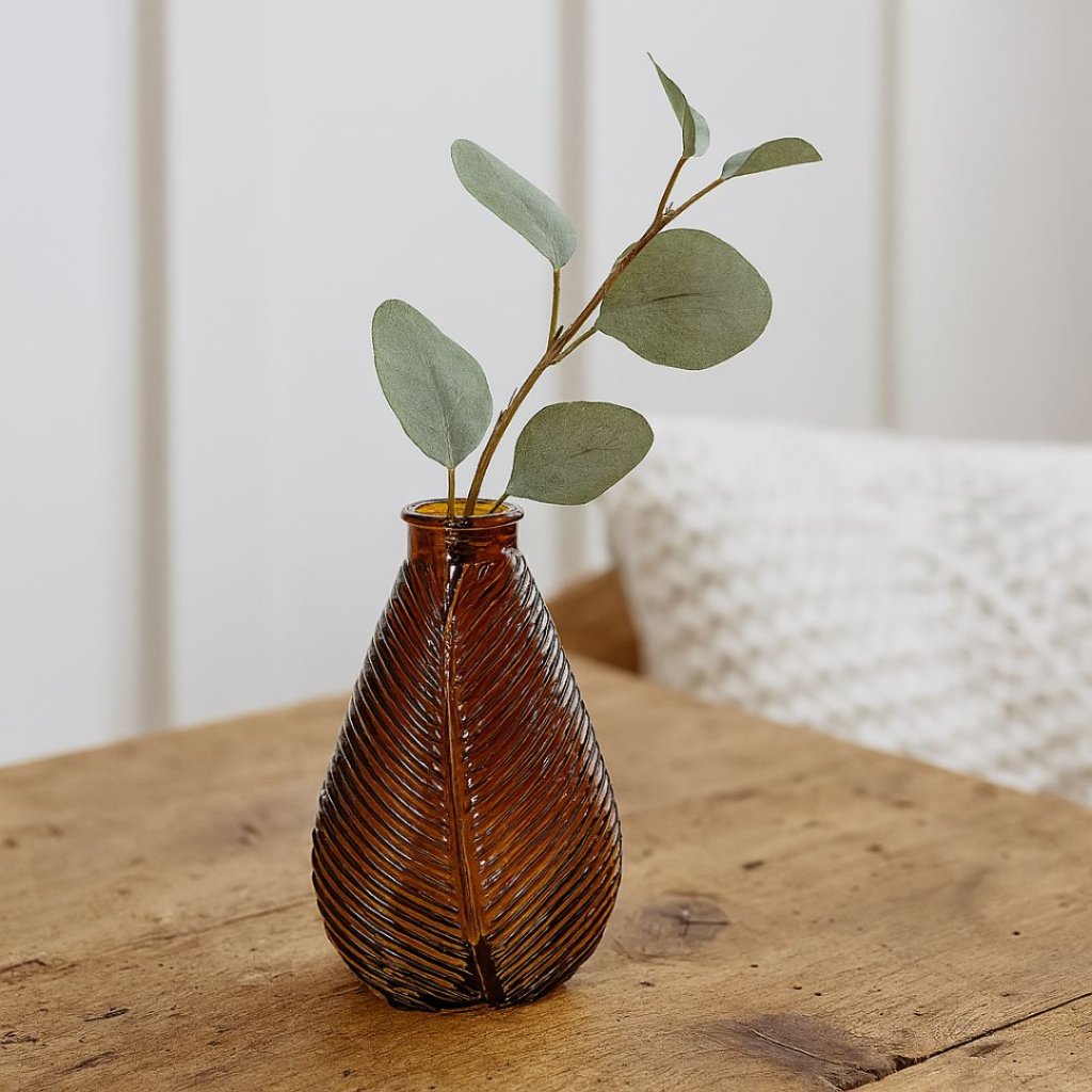 - Elegantní skleněná váza v odstínu amber, která okouzlí svým sofistikovaným designem a jemným reliéfem inspirovaným přírodou.