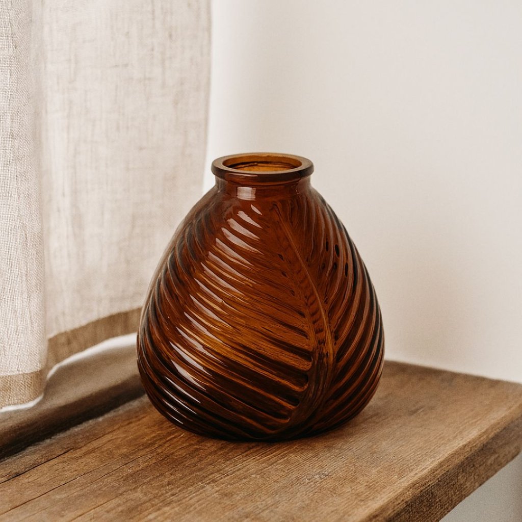 - Elegantní skleněná váza v odstínu amber, která okouzlí svým sofistikovaným designem a jemným reliéfem inspirovaným přírodou.