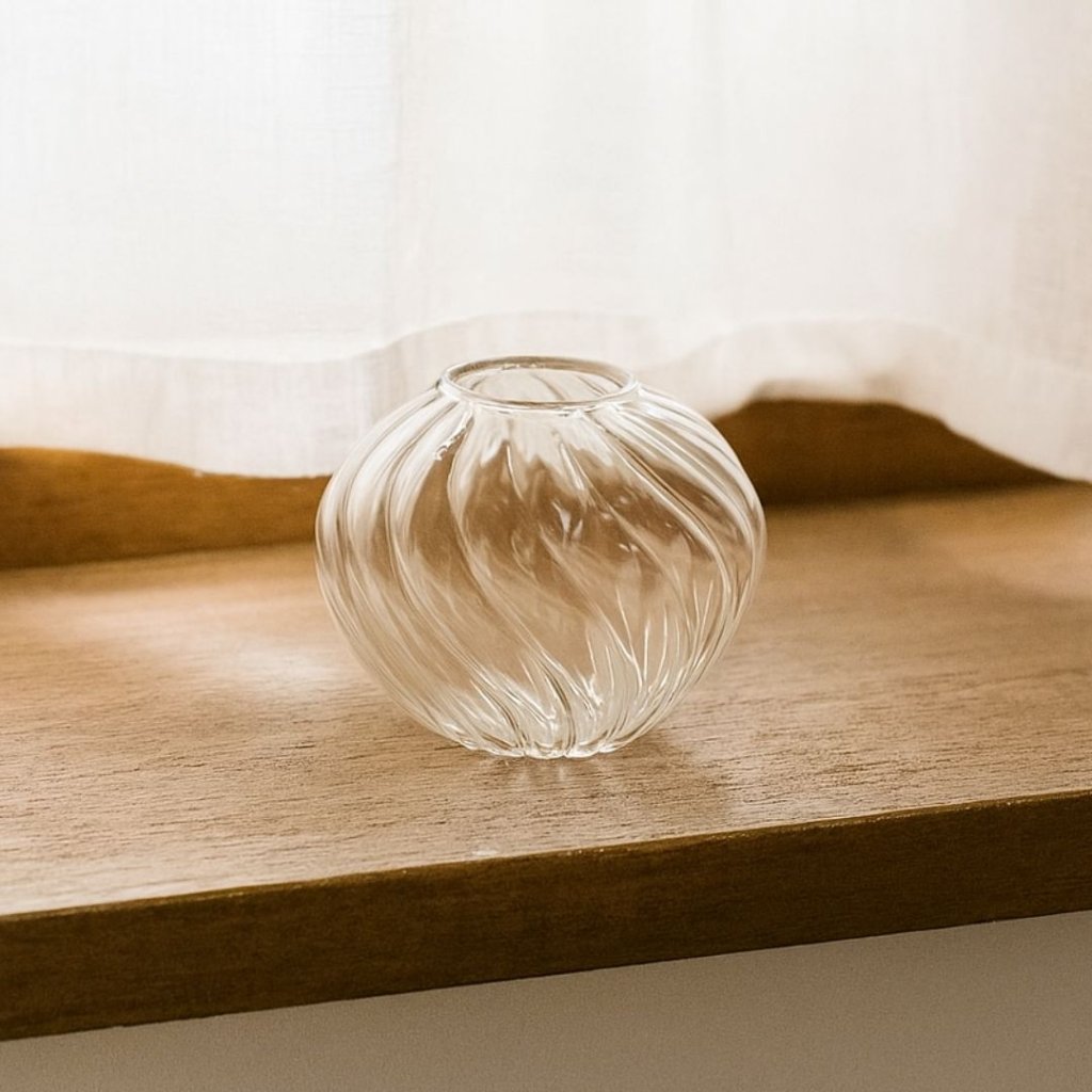 - Skleněná vázička s elegantním spirálovitým vzorem, který zachycuje světlo a vytváří jemný dekorativní efekt.