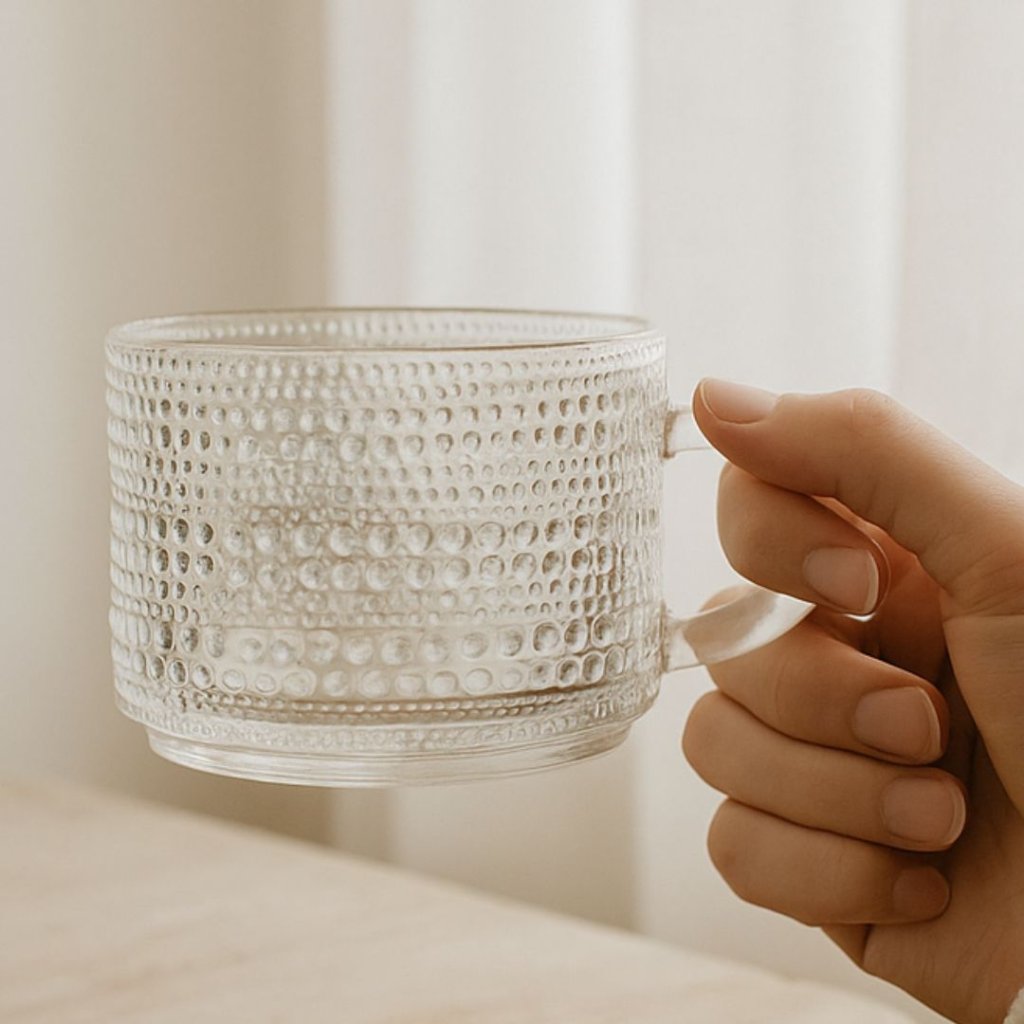 - Dopřejte si radost z každého doušku. Tento elegantní skleněný hrnek s jemným reliéfem v sobě spojuje jednoduchost skandinávského stylu a nádech nostalgie. Pohodlně padne do ruky a jeho 350 ml objem je tak akorát na ranní kávu, čaj nebo horkou čokoládu. Použití do 60 stupňů