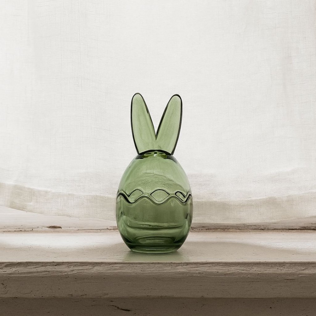 - Dóza je vyrobena ze zeleného skla, což jí dodává lehkost a jemnost, a její tvar vajíčka s detailem zaječích oušek ji činí originálním doplňkem pro velikonoční sezónu.