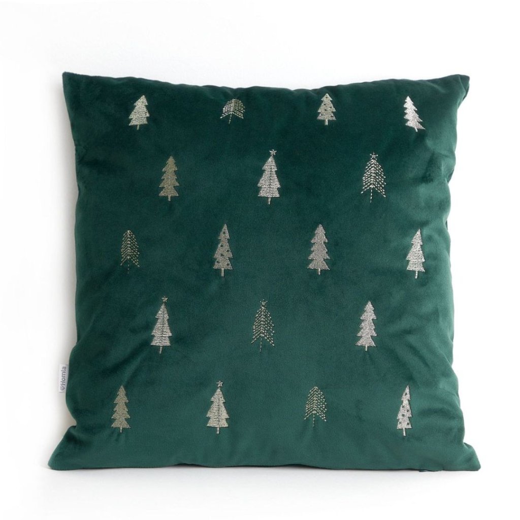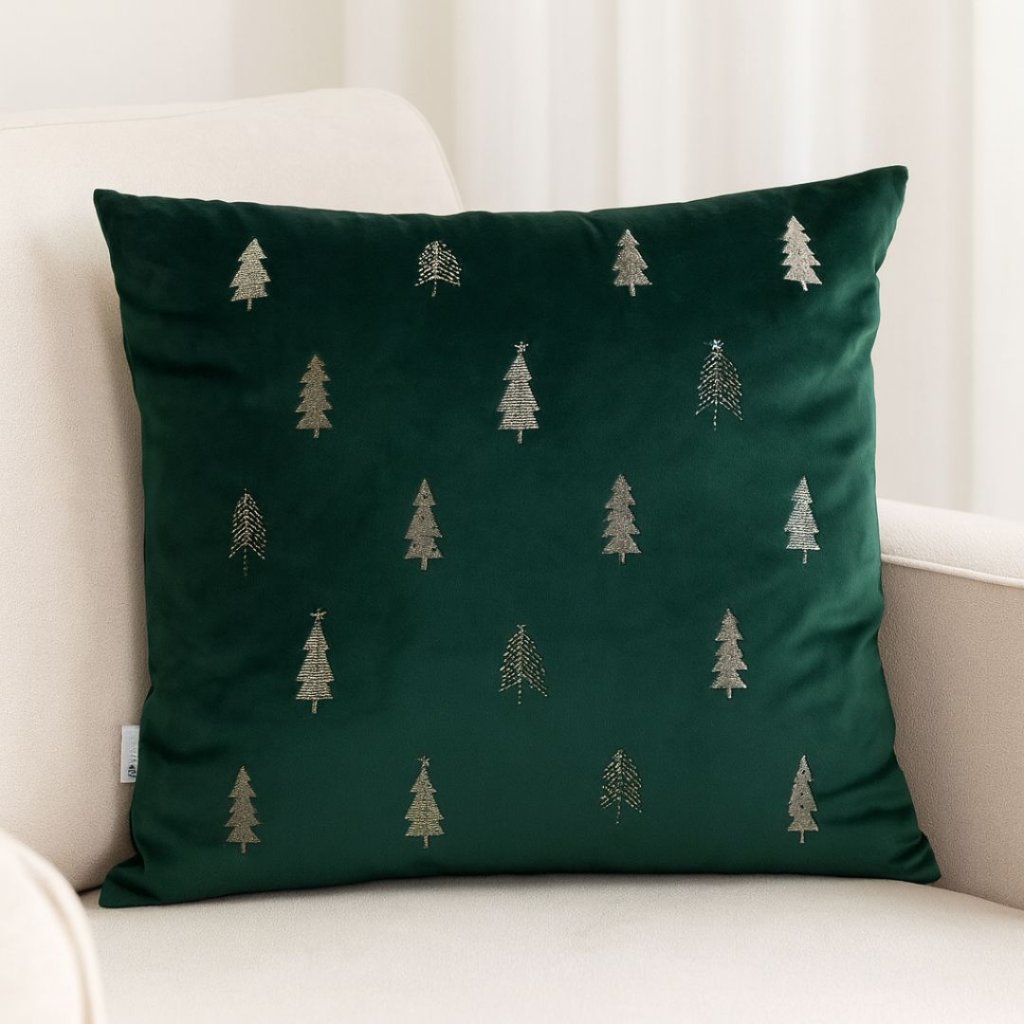 - Tento tmavě zelený povlak na polštář zdobí jemné vyšívané zlaté stromečky, které se krásně lesknou v dopadu světla a dodají interiéru hřejivý, elegantní dotek.