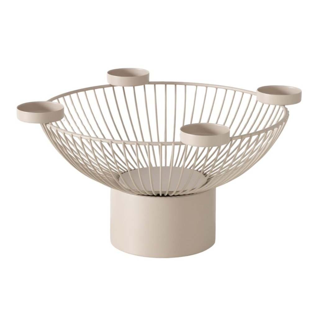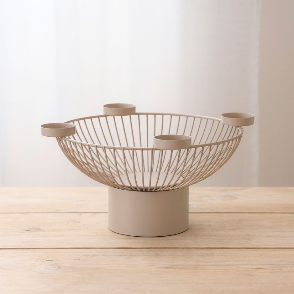 - Stylová kombinace elegance a funkčnosti. Tento svícen, který zároveň slouží jako mísa, se stane středobodem vašeho domova – ať už ho využijete na svíčky, ořechy nebo sezonní dekorace. Jeho jemný béžový odstín a vzdušná kovová konstrukce zapadnou do minimalistického i rustikálního interiéru.
