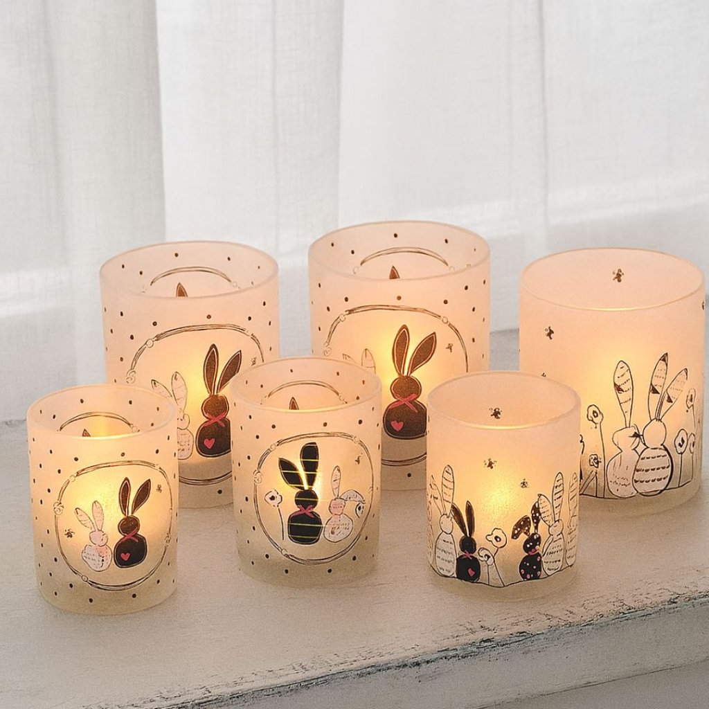 - Skleněný svícen s více motivy zajíčků, v sadě po dvou kusech, jeden malý a jeden větší svícen.