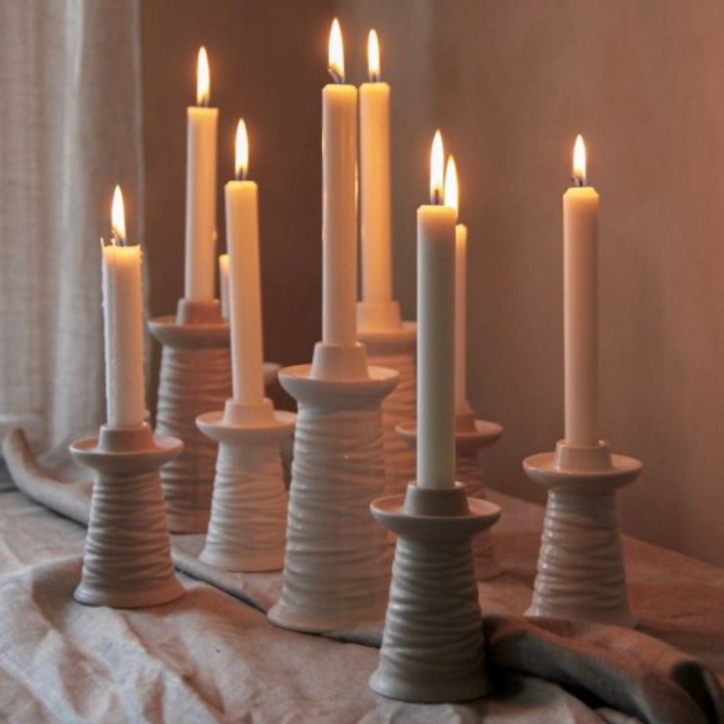 Keramický svícen v jémné béžové matné barvě na kuželovou nebo kónickou svíčku pro milovnice jednoduchosti a stylu. Krásný jemný svícen, který má originální design v podobě vlnek.