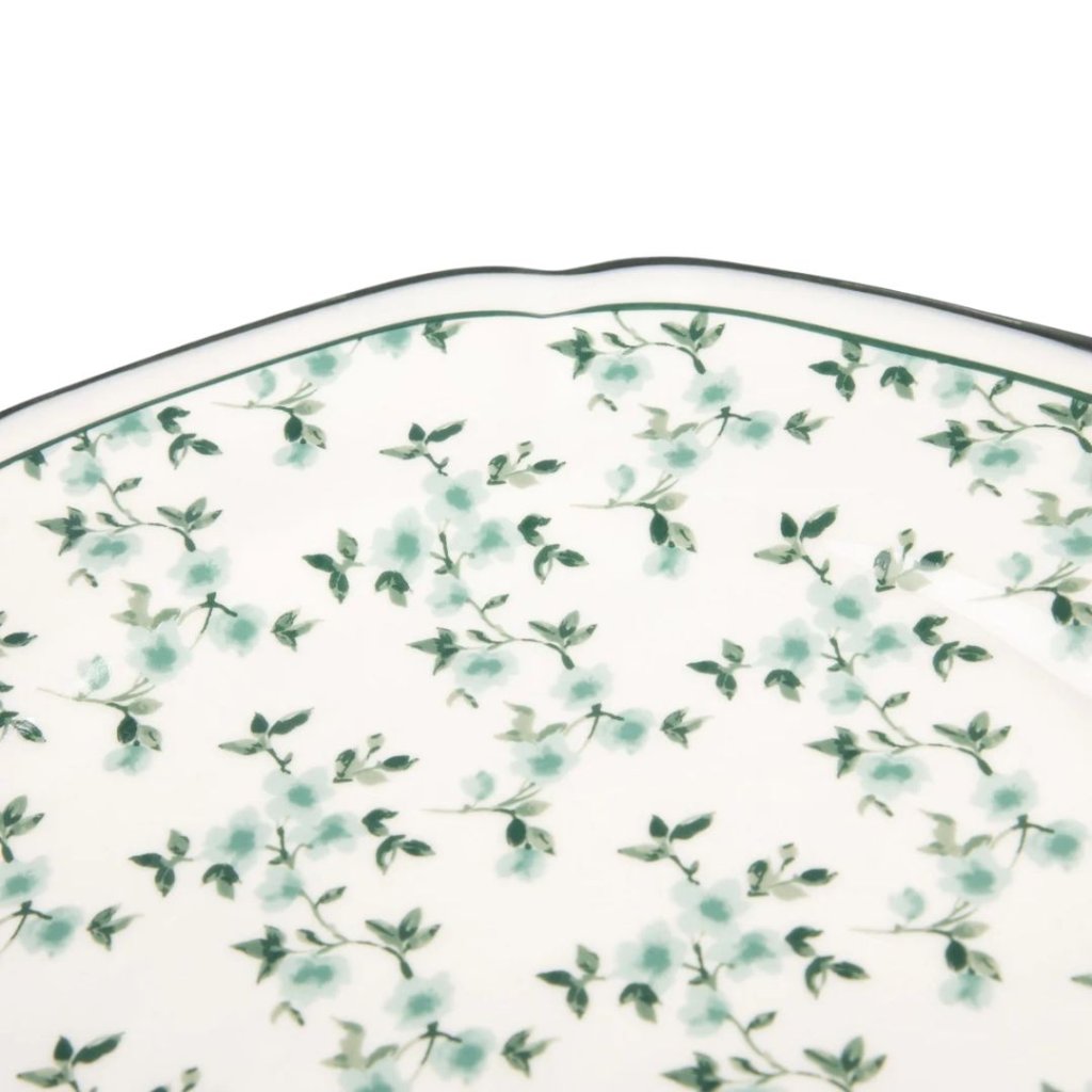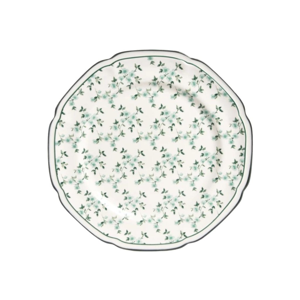 - Obědový porcelánový talíř s jemnými květy a vlnitým okrajem