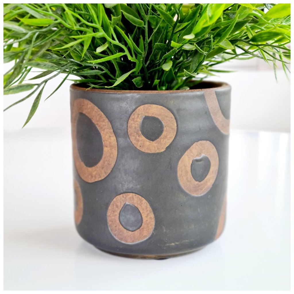 Terakotový květináč v černé barvě s přírodní hnědou barvou ve tvaru koleček se bude vyjímat u vás doma,je pro milovnice černé barvy a květiny mu budou slušet.Značka Bloomingville miluje tlumené barvy v přírodním stylu a my také,proto jsem vám dala do nabídky tento krásný terakotový květináč.