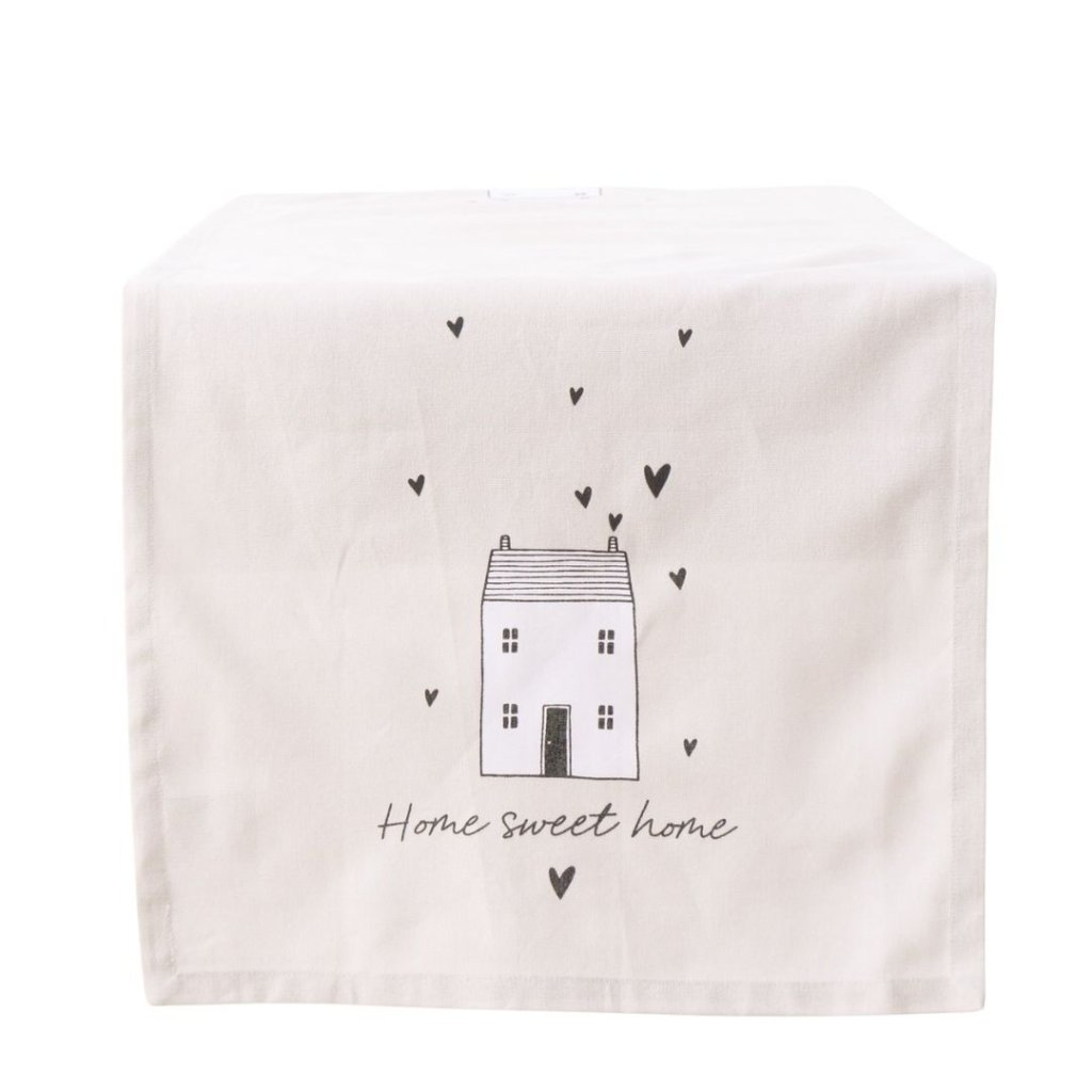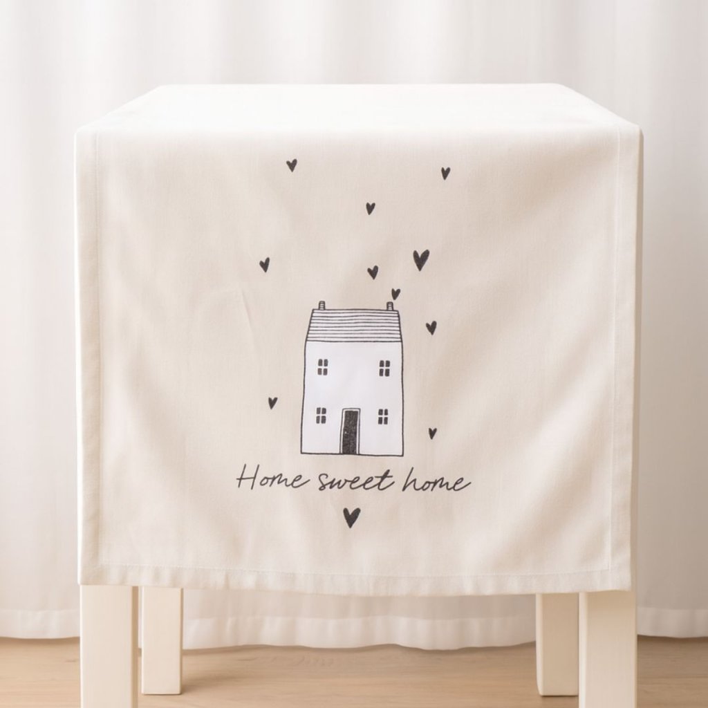 - Krásný bavlněný běhoun, který vnese do vašeho domova jemnost a útulnou atmosféru. Na světle šedém podkladu se vyjímá jednoduchý motiv domečků a srdíček – připomínka, že to největší kouzlo se děje právě doma. Skvěle se hodí na jídelní nebo konferenční stůl a díky svému univerzálnímu designu zapadne do každého interiéru, zvlášť toho ve skandinávském či rustikálním stylu.