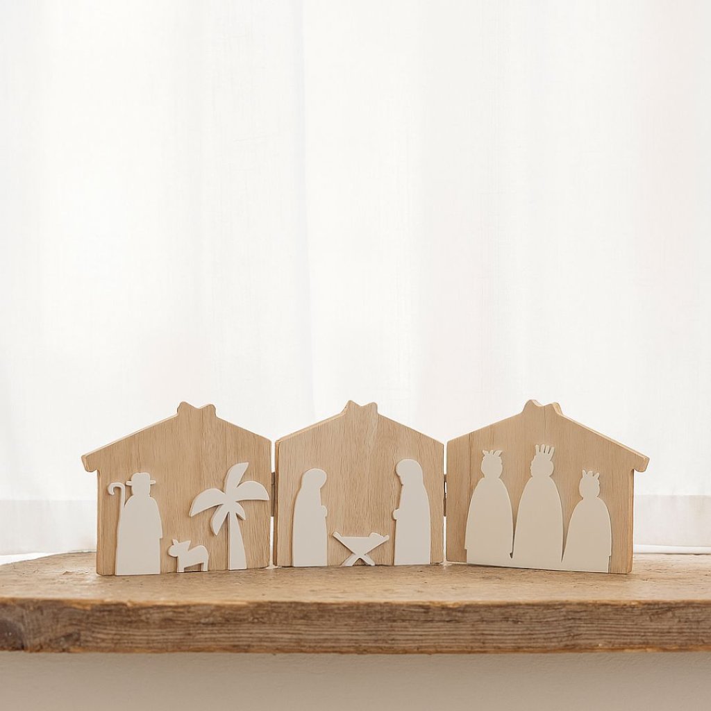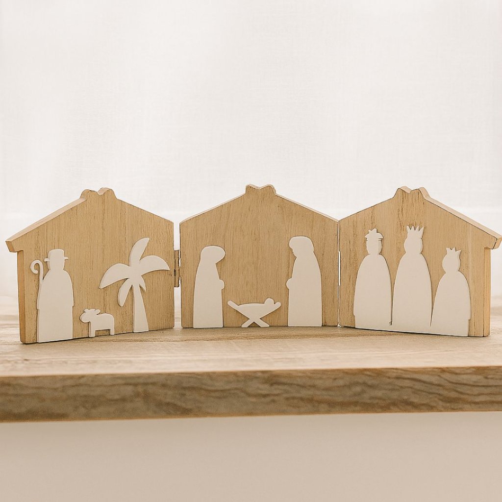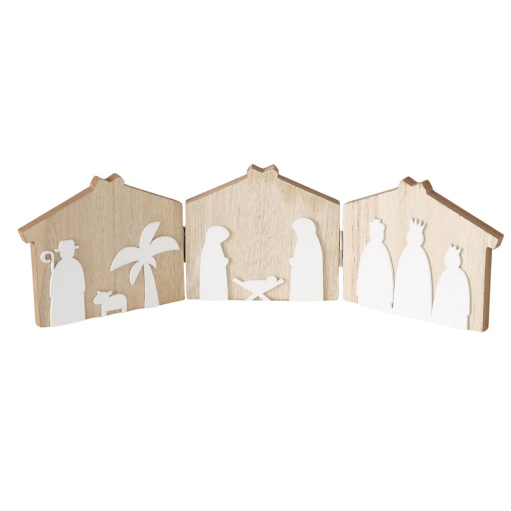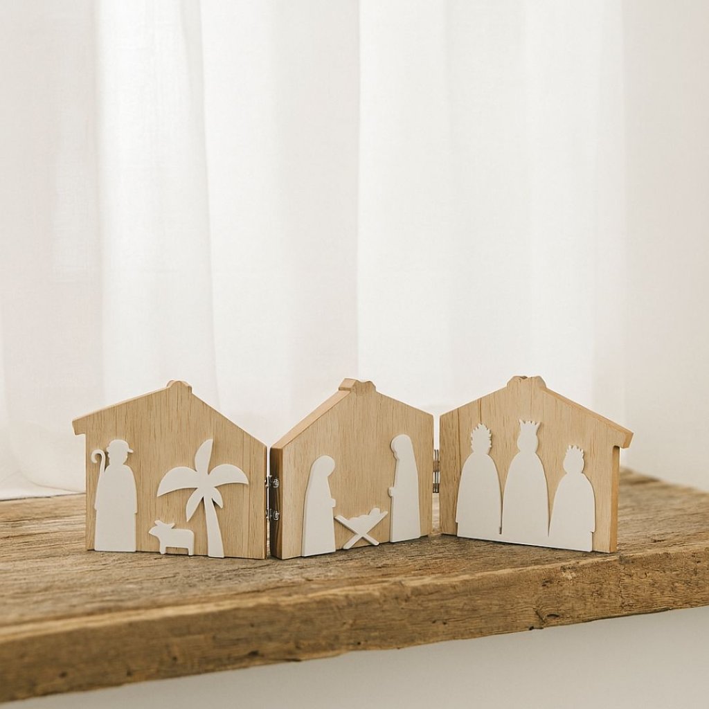 - Skládací betlém z přírodního dřeva s bílými siluetami postav přináší do interiéru klidnou vánoční atmosféru.