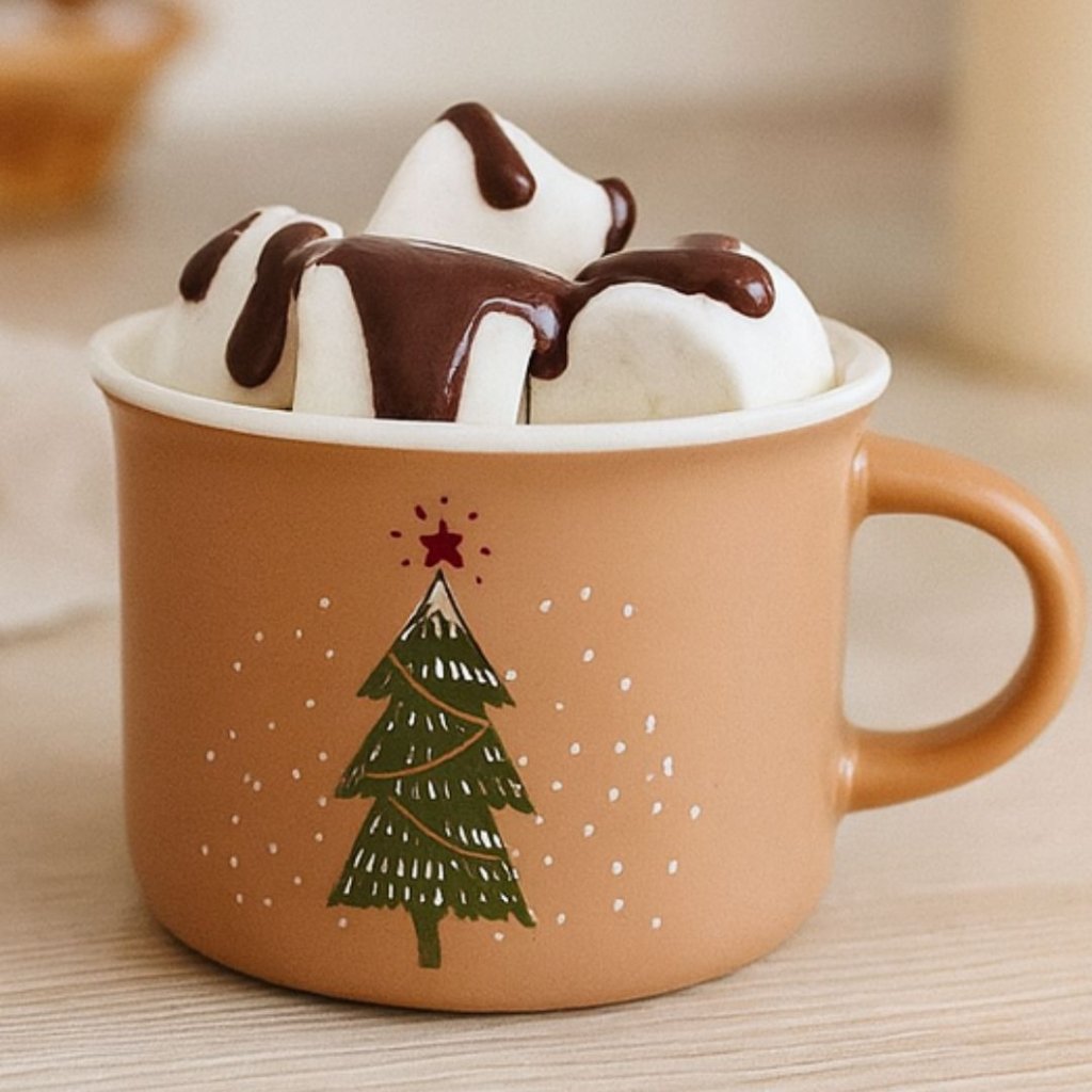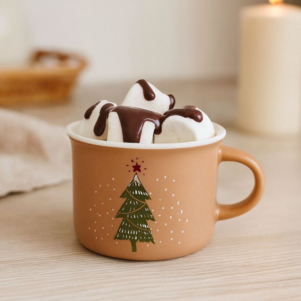 - Tento keramický hrnek v jemném béžovo-karamelovém odstínu s malovaným stromkem a drobnými sněhovými tečkami vnese do vašeho domova tu pravou zimní pohodu.