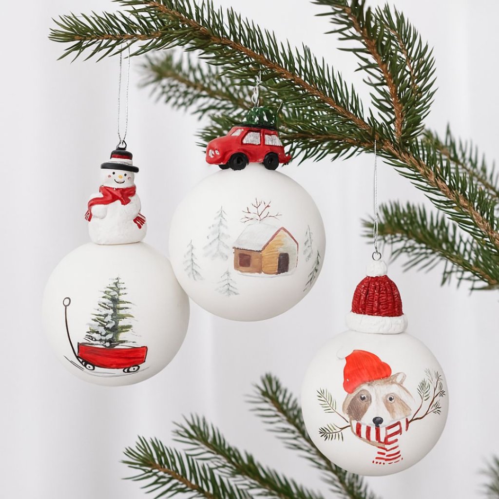 - Skleněné vánoční ozdoby v jemných tónech zdobené ručně malovanými zimními motivy – zasněžená chaloupka, vánoční stromeček na saních, roztomilá lyška v kulichu a sněhulák s červenou šálou. Každá koule je zakončena 3D dekorem – autíčkem, sněhulákem nebo čepicí – a dodává tak ozdobám hravý a originální vzhled.