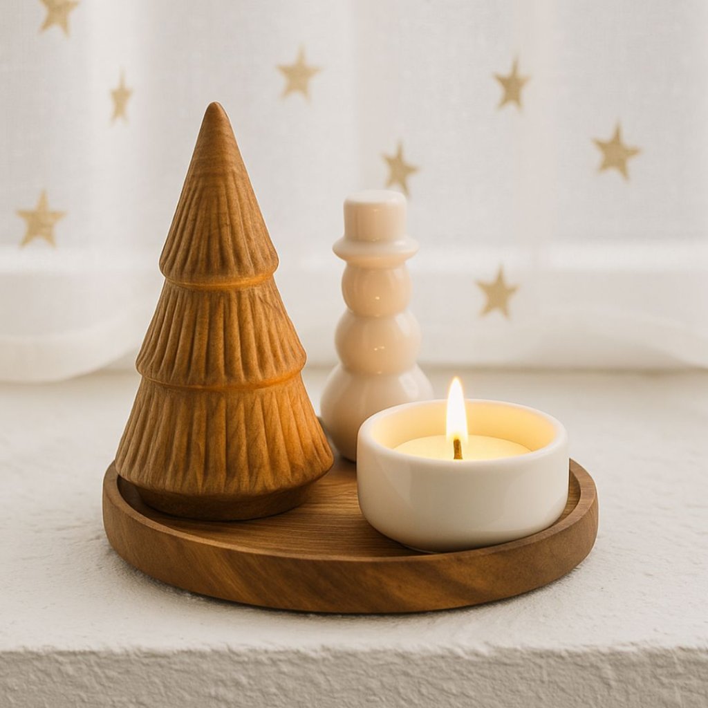 - Elegantní minimalistická dekorace na podnosu s jemným vánočním nádechem.