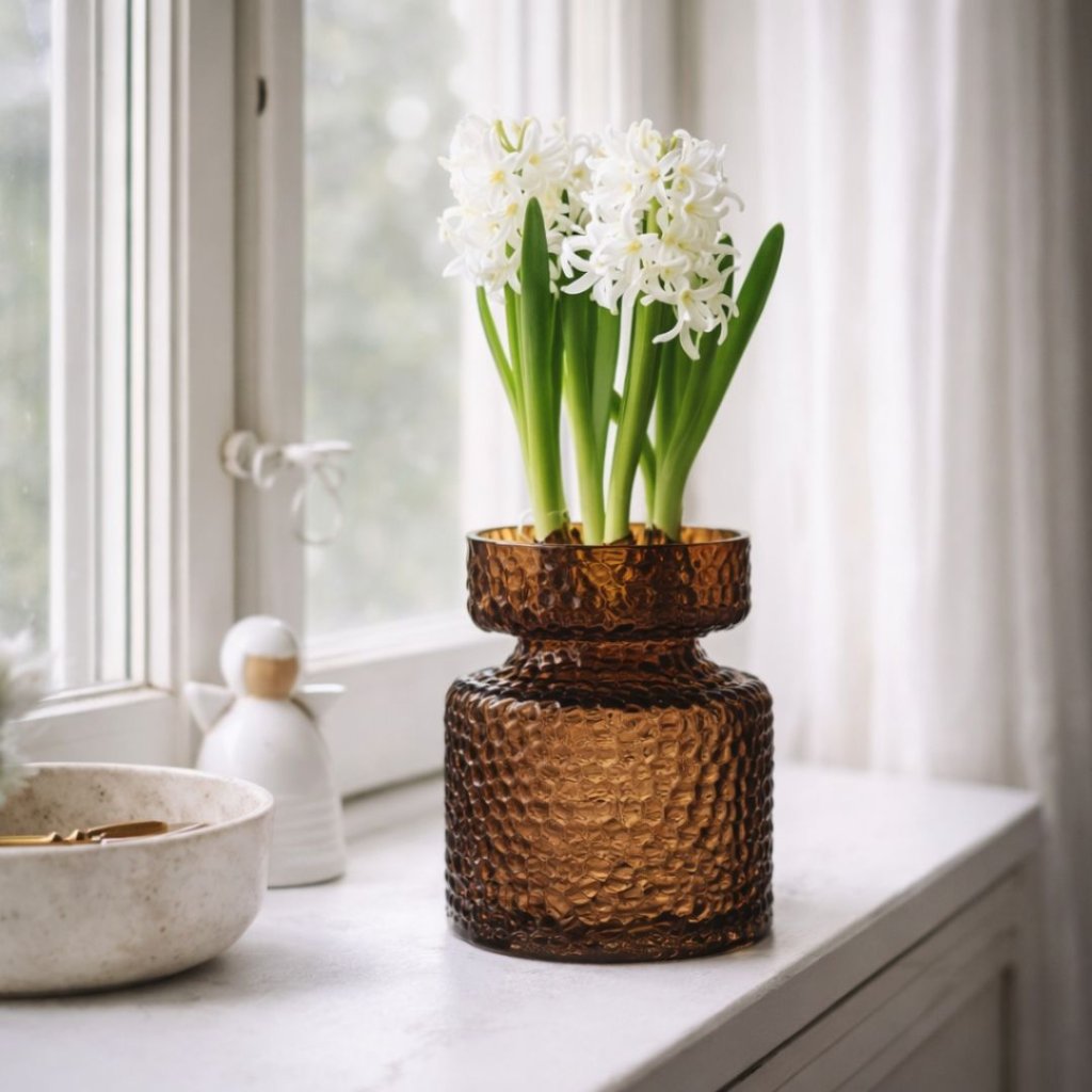 - Tato váza na hyacinty je vyrobena z hnědého skla a působí luxusním dojmem díky svému jedinečnému designu s texturou připomínající diamanty.