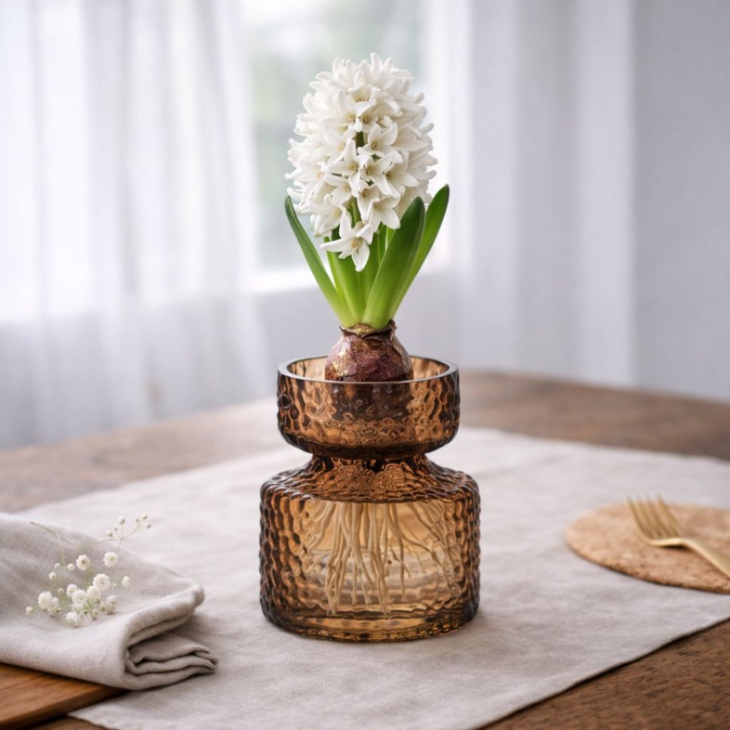 - Hnědé sklo s jemnou strukturou, která zachytí světlo.Tvar navržený pro pěstování cibulovin – funkční i dekorativní.