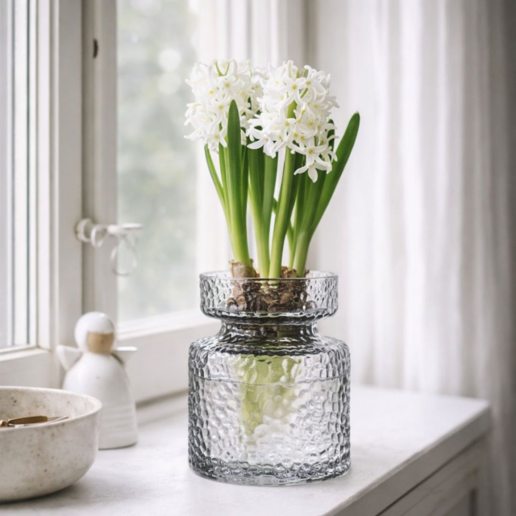 - Váza je ideální pro pěstování cibulovin, jako jsou hyacinty, a její tvar a povrchová úprava ji dělají nejen funkční, ale i dekorativní součástí interiéru.