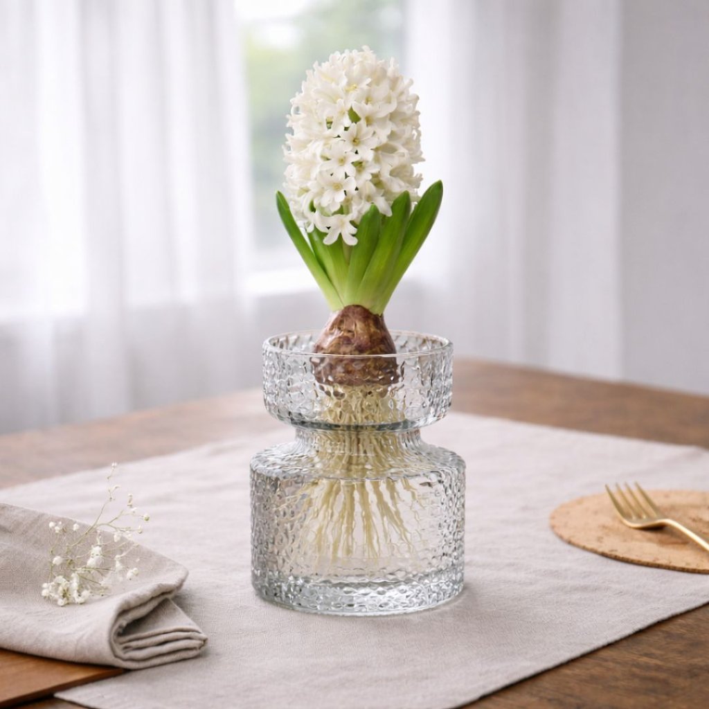 - Čiré sklo s jemnou strukturou, která krásně pracuje se světlem. Tvar navržený speciálně pro cibuloviny umožňuje přirozené zakořenění i růst.