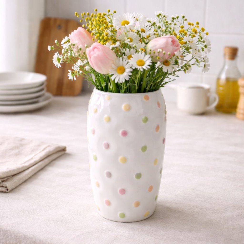Minimalistický tvar doplněný pastelovými detaily působí svěže, přirozeně a krásně zvýrazní květiny i samostatně jako dekoraci. Ideální volba pro jarní aranžmá i každodenní radost z detailů.