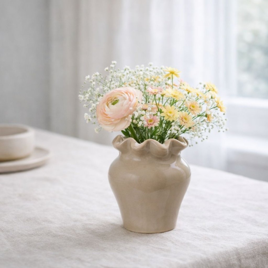 - Tato roztomilá vázička o výšce 10 cm je dokonalým spojením elegance a jemnosti. Její hladký povrch a béžová barva ji činí univerzální dekorací, která se hodí do jakéhokoliv interiéru.