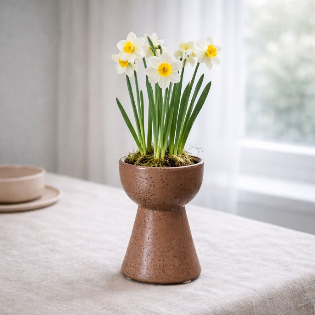 - Malý detail, který dělá jaro. Kameninová váza v hnědé melange nechává hyacinty přirozeně vyniknout a prostoru dodává klid.