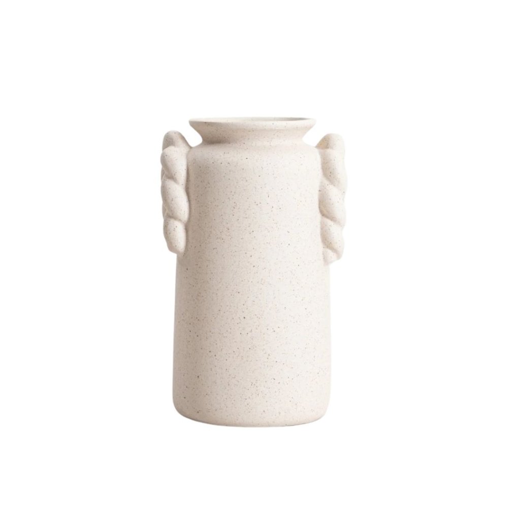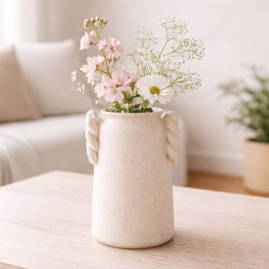 - Minimalistická silueta doplněná plastickými „copánky“ po stranách dává váze jemný, ale výrazný charakter. Písková úprava s drobným tečkováním působí přirozeně a hřejivě – krásná sama o sobě i s jednoduchými květy.