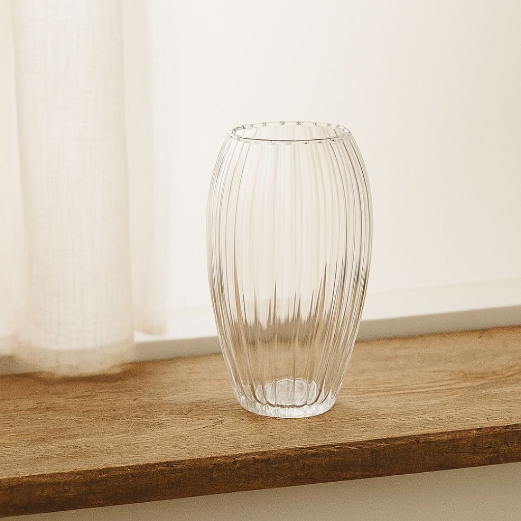 • Elegantní skleněná váza s jemnými svislými drážkami, které dodávají jejímu designu sofistikovaný nádech.