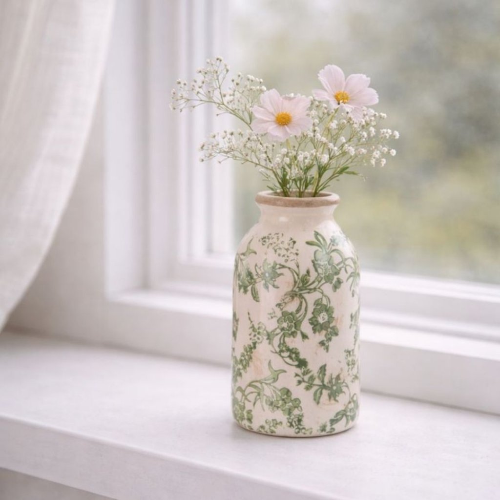 Ulla má jemný květinový motiv v zelených tónech, trochu připomíná staré herbáře a klidná rána u otevřeného okna. Je ideální pro jednu větvičku, luční květ nebo obyčejnou zelenou snítku utrženou cestou domů. - Ulla je váza pro malé radosti. Pro chvíle, kdy stačí málo, aby doma bylo dobře.