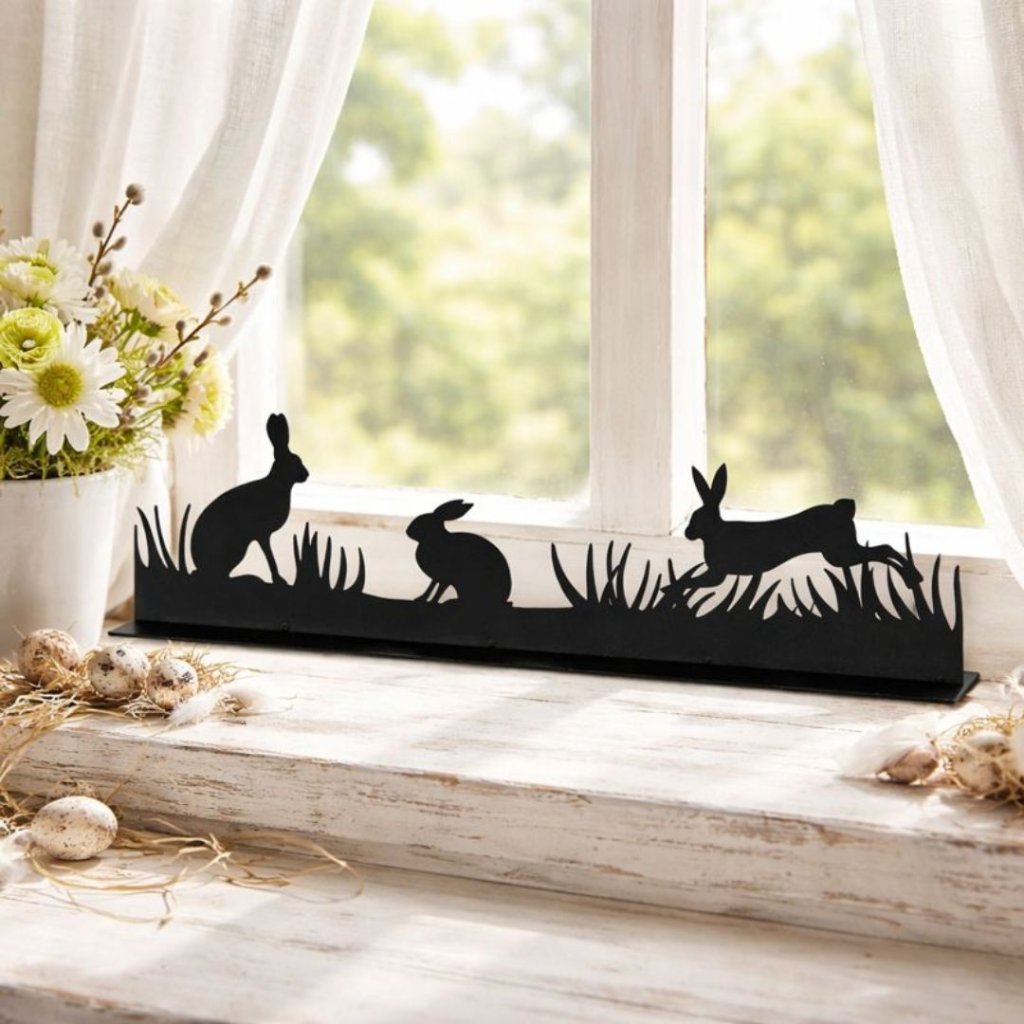 - Velikonoční kovová dekorace se zajíčky Blacky 🐇 Jednoduchá, elegantní a plná jarní atmosféry. Černá kovová silueta zajíčků krásně vynikne na parapetu, polici i komodě.