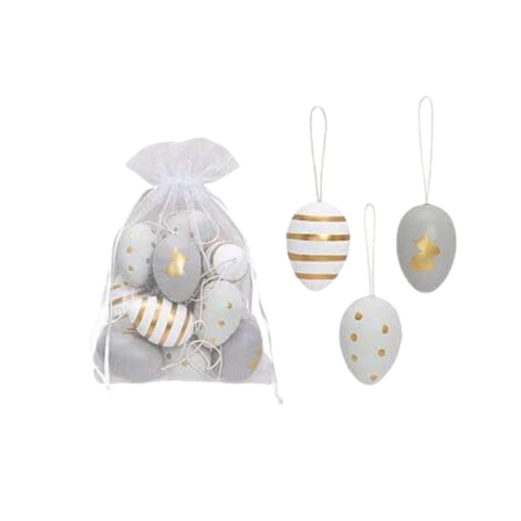 Velikonoční vajíčka v šedé barvě s motivem proužků, puntíků a zajíc nesmí chybět. Balení je v sáčku z organzy po 12 kusech, velikonoční závěsná vajíčka jistě ozdobí váš krásný domov.