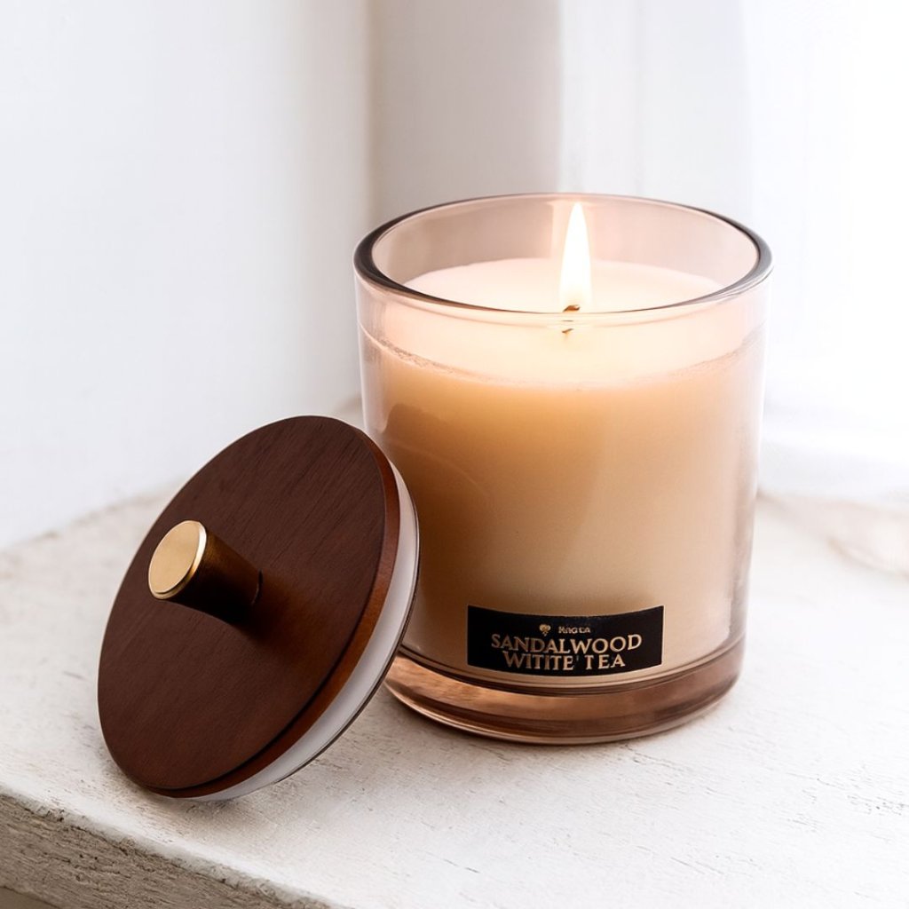 - 🕯️ S praktickým dřevěným víčkem s kovovým detailem – chrání vosk i vůni