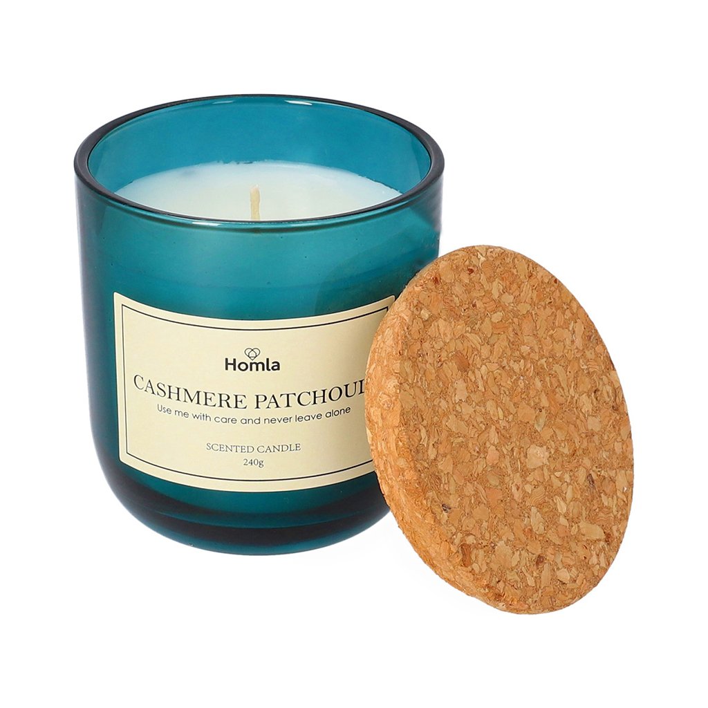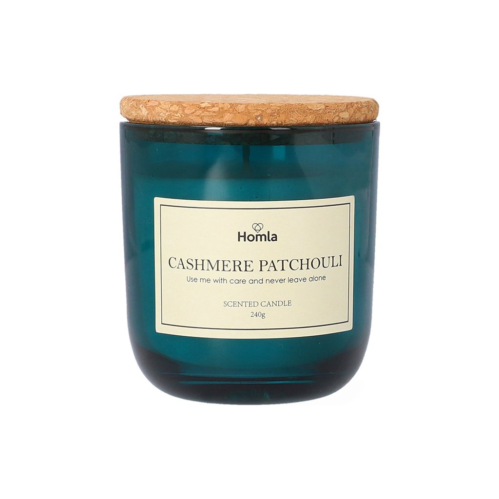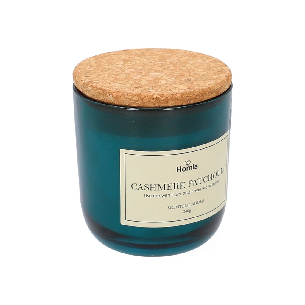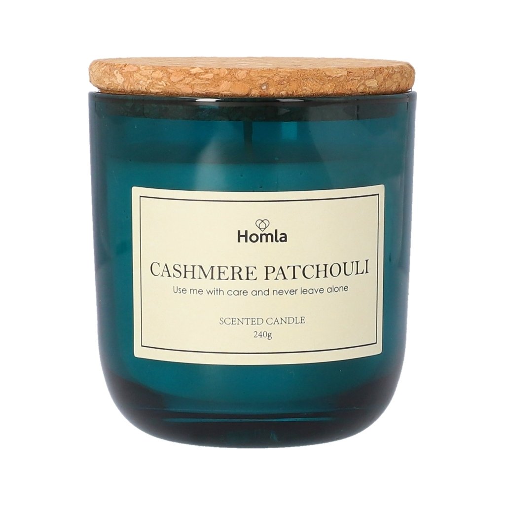 - Velká vonná svíčka Cashmere Patchouli je lehká parafínová s výraznou vůní pačuli , která je umístěna v jednoduché skleněné nádobě o objemu 240 g . Nádoba je vyrobena z průhledného tmavě modrého skla . Součástí je i korkové víčko.