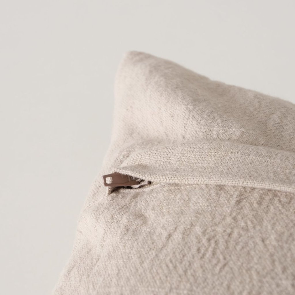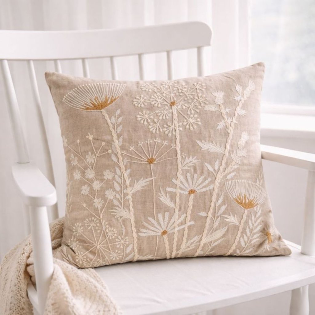 - Béžový lněný polštář je jako něžná jarní louka ukrytá v látce. Ručně tkané roztomilé květiny mu dodávají jedinečný kouzelný vzhled, jemné, hravé a zároveň elegantní.