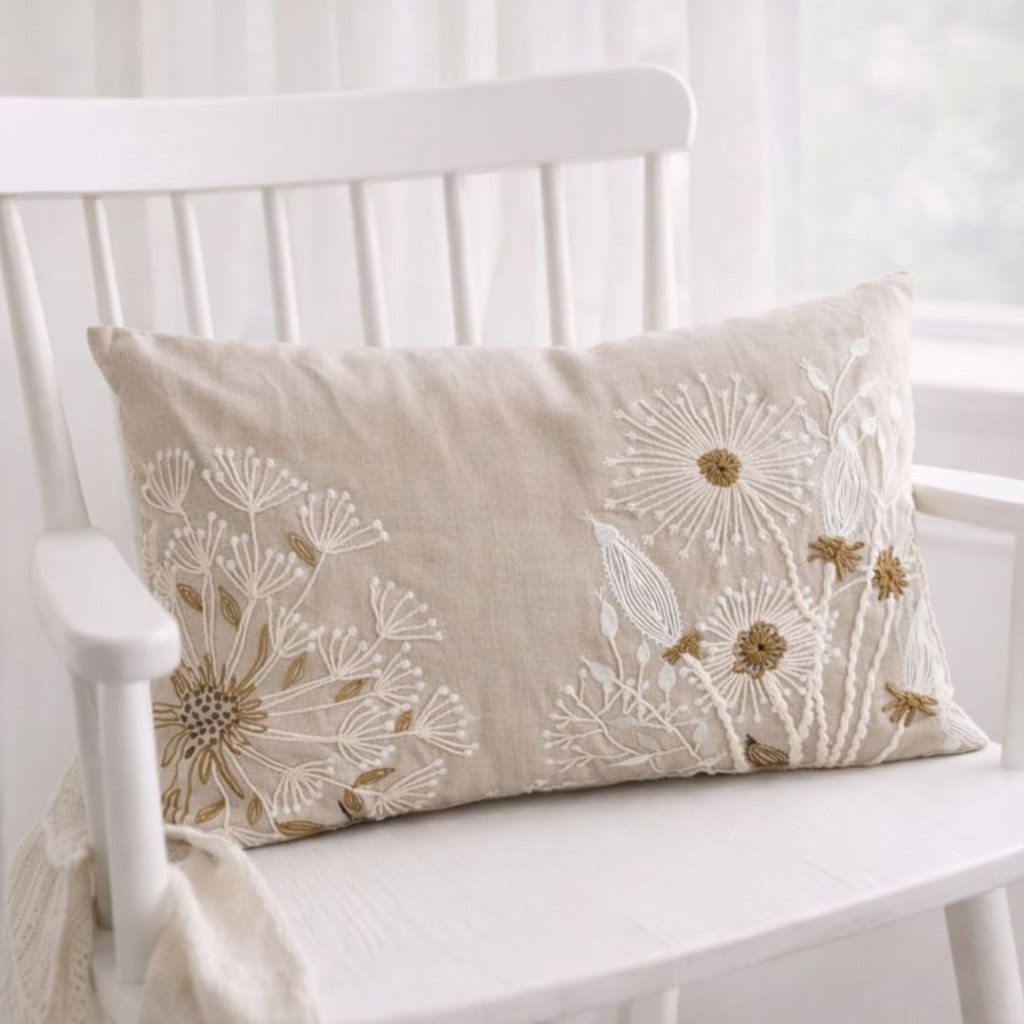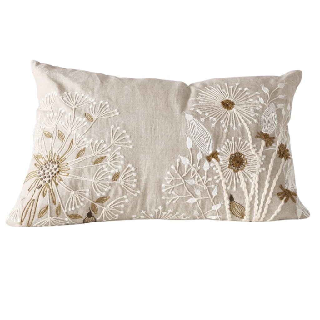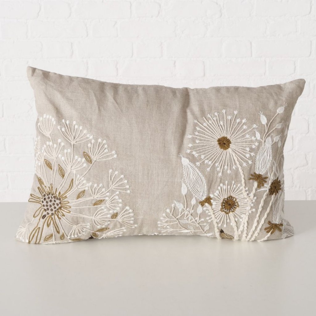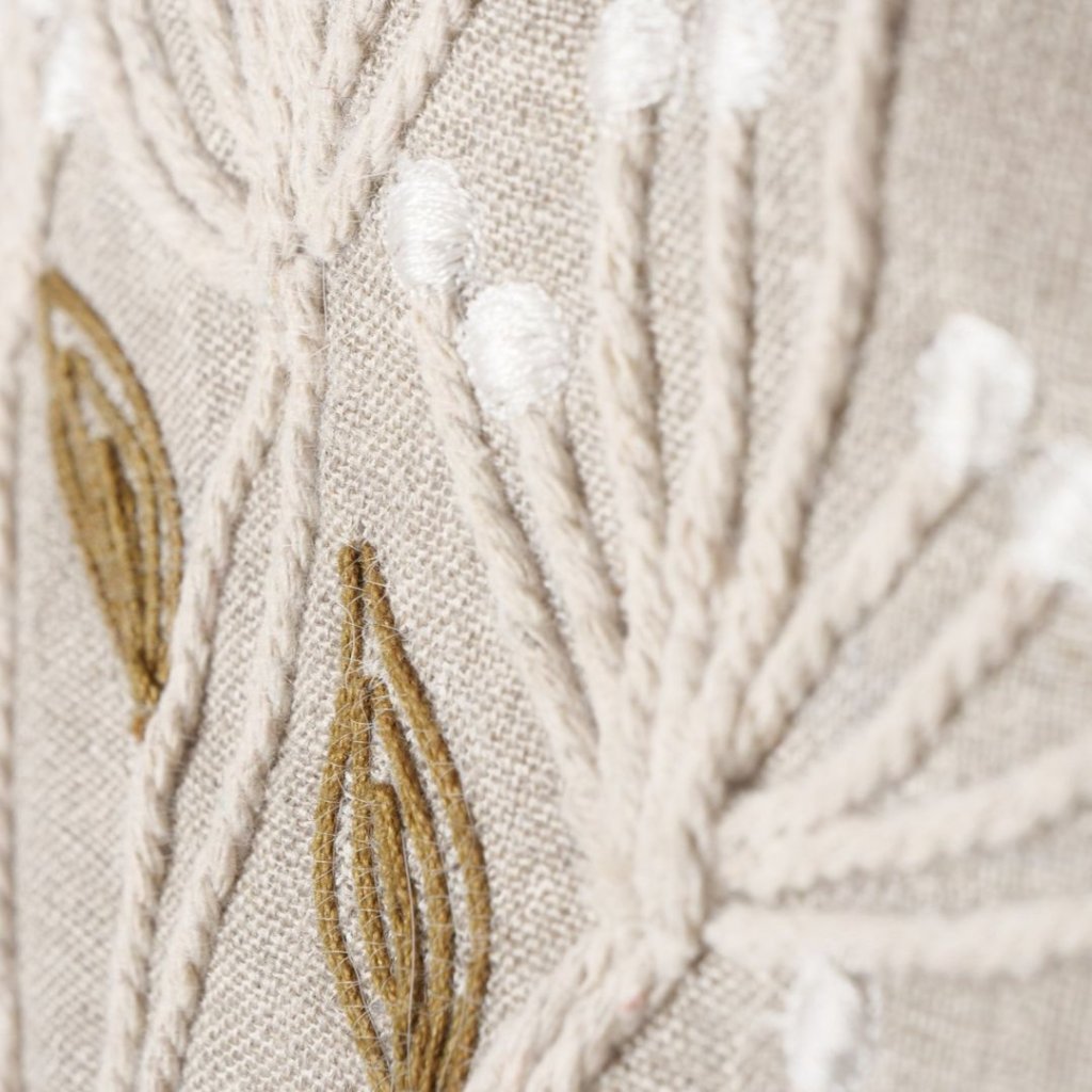 - Béžový lněný polštář je jako něžná jarní louka ukrytá v látce. Ručně tkané roztomilé květiny mu dodávají jedinečný kouzelný vzhled, jemné, hravé a zároveň elegantní.