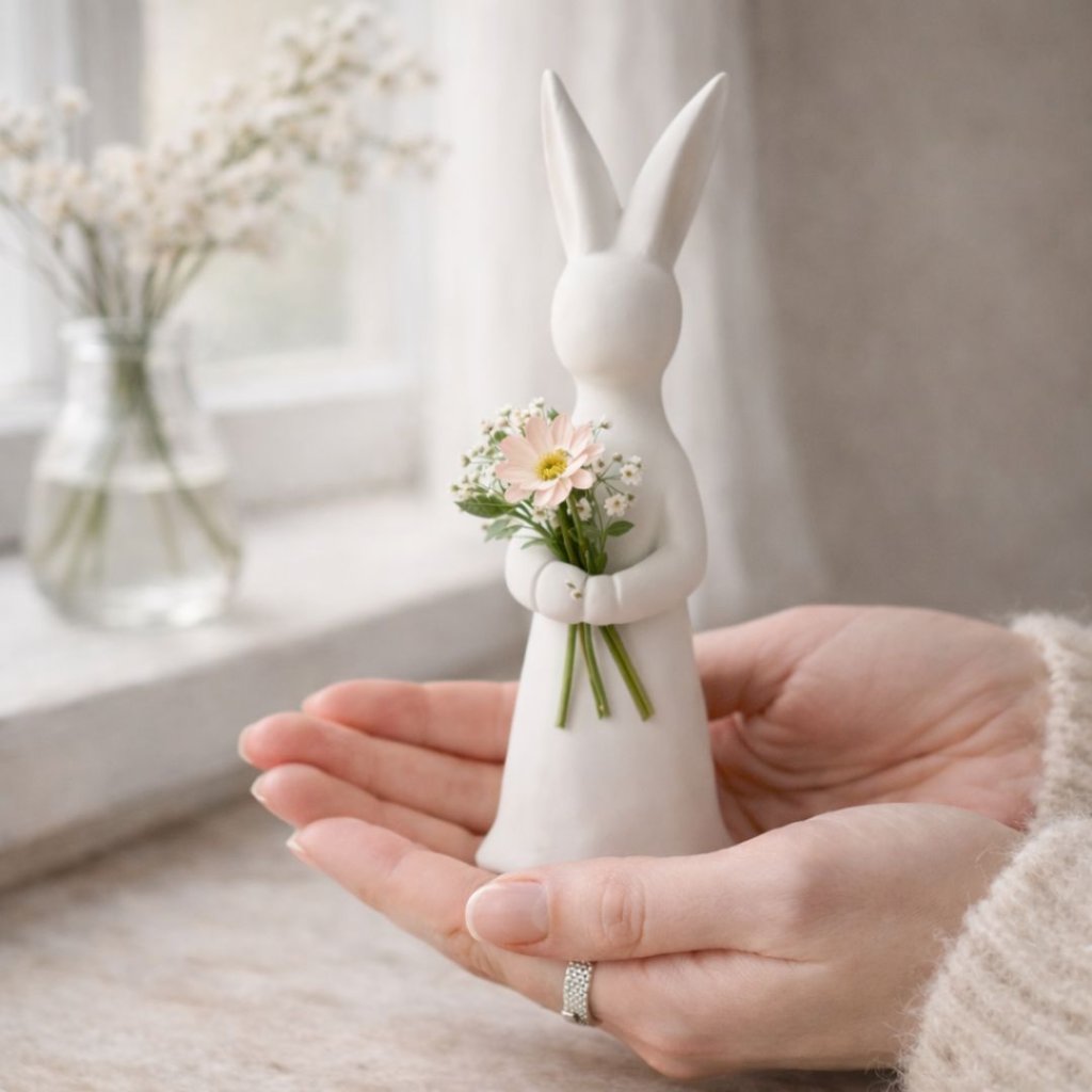 Matně bílý zajíček jemně drží květinu a přináší do interiéru klid a lehkost.