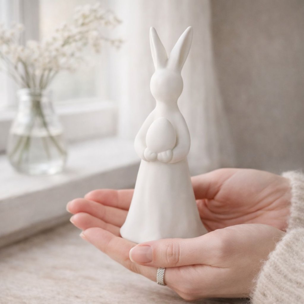 Matně bílý keramický zajíček drží vajíčko s lehkostí a klidem.