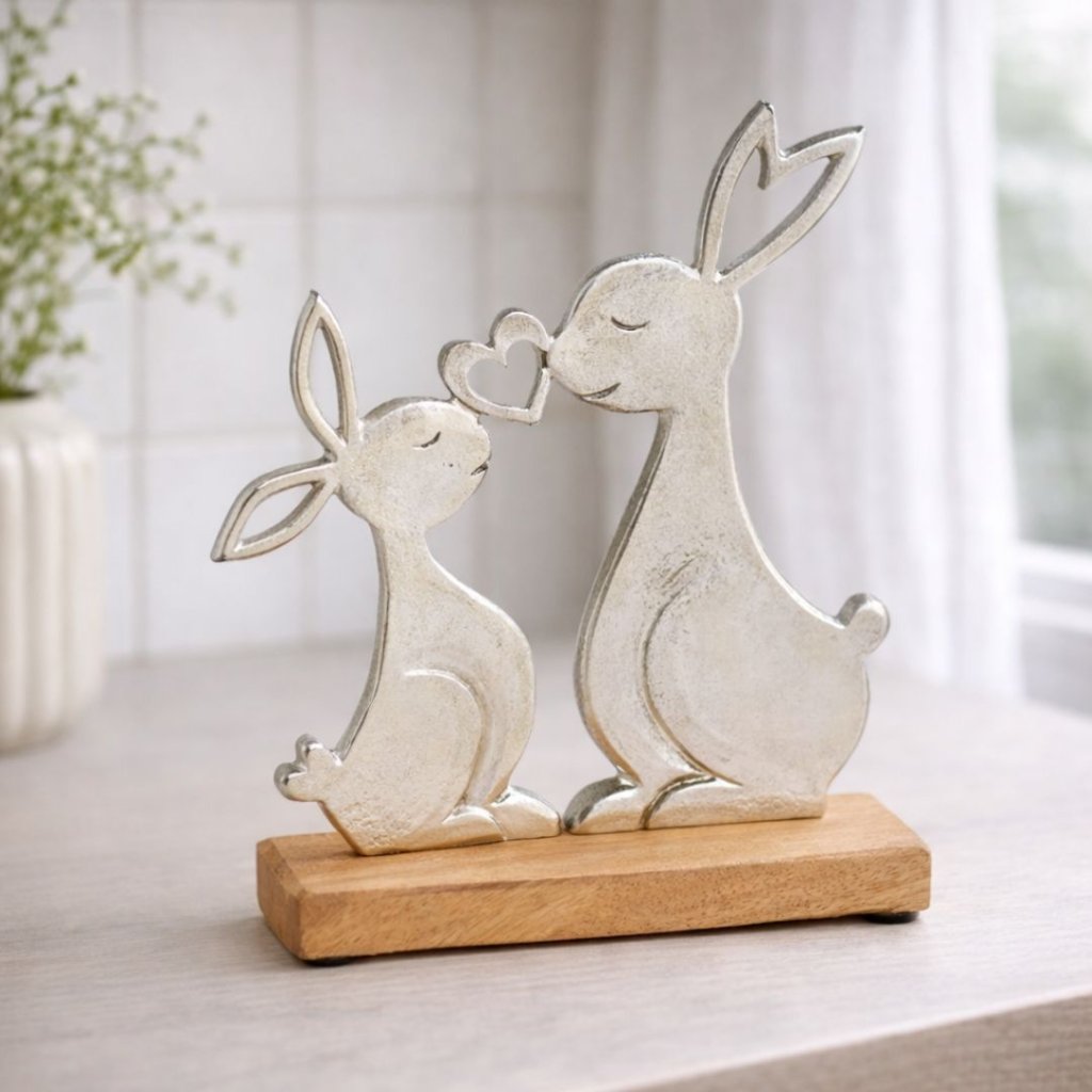 Stříbrní zajíci na podstavci z mangového dřeva krásně vyniknou na parapetu i komodě a dodají prostoru tichý jarní akcent.