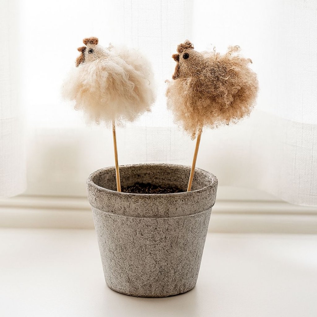 - Slepičky jsou jemně zpracované s měkkým textilním povrchem a upevněné na dřevěné tyčce, což je činí ideálními pro umístění do květináčů, velikonočních aranžmá 🤎