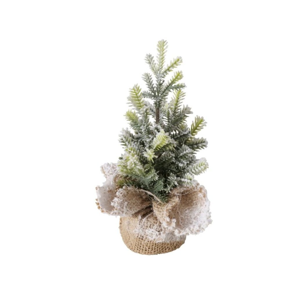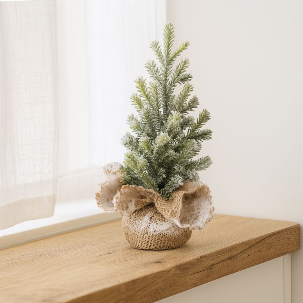 - Umělý zasněžený stromek v jutovém obalu jako krásná zimní dekorace.