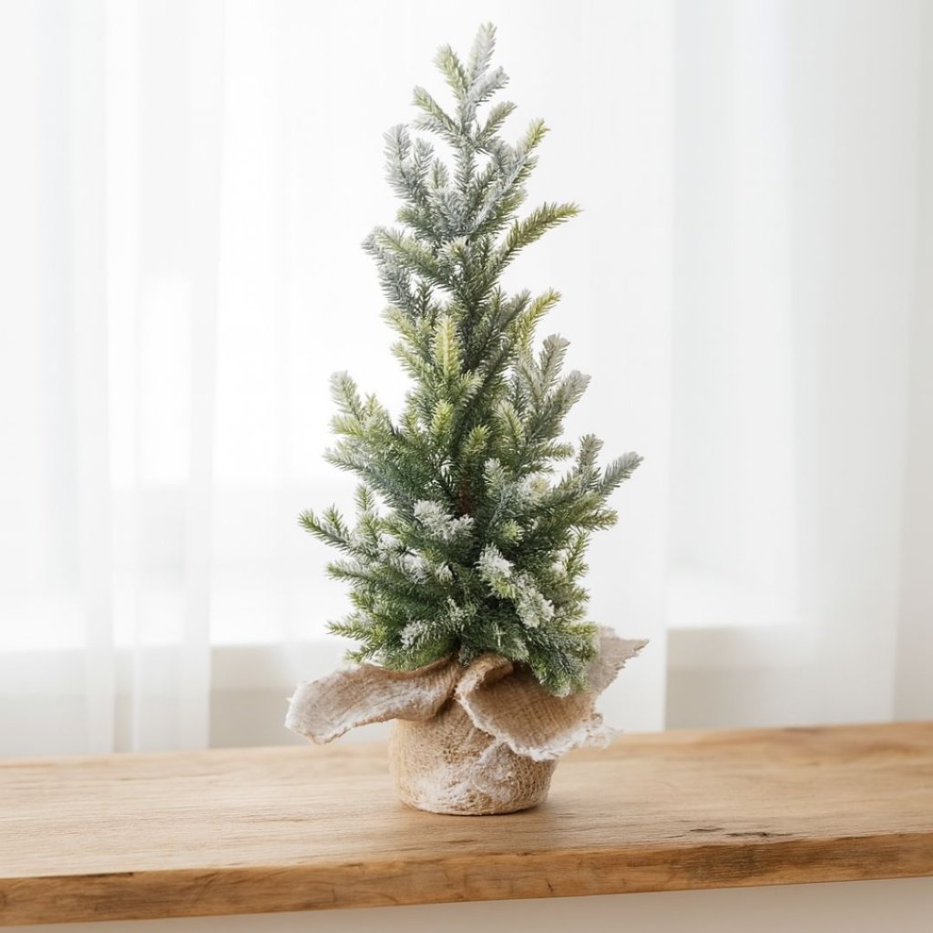- Umělý zasněžený stromek v jutovém obalu jako krásná zimní dekorace.