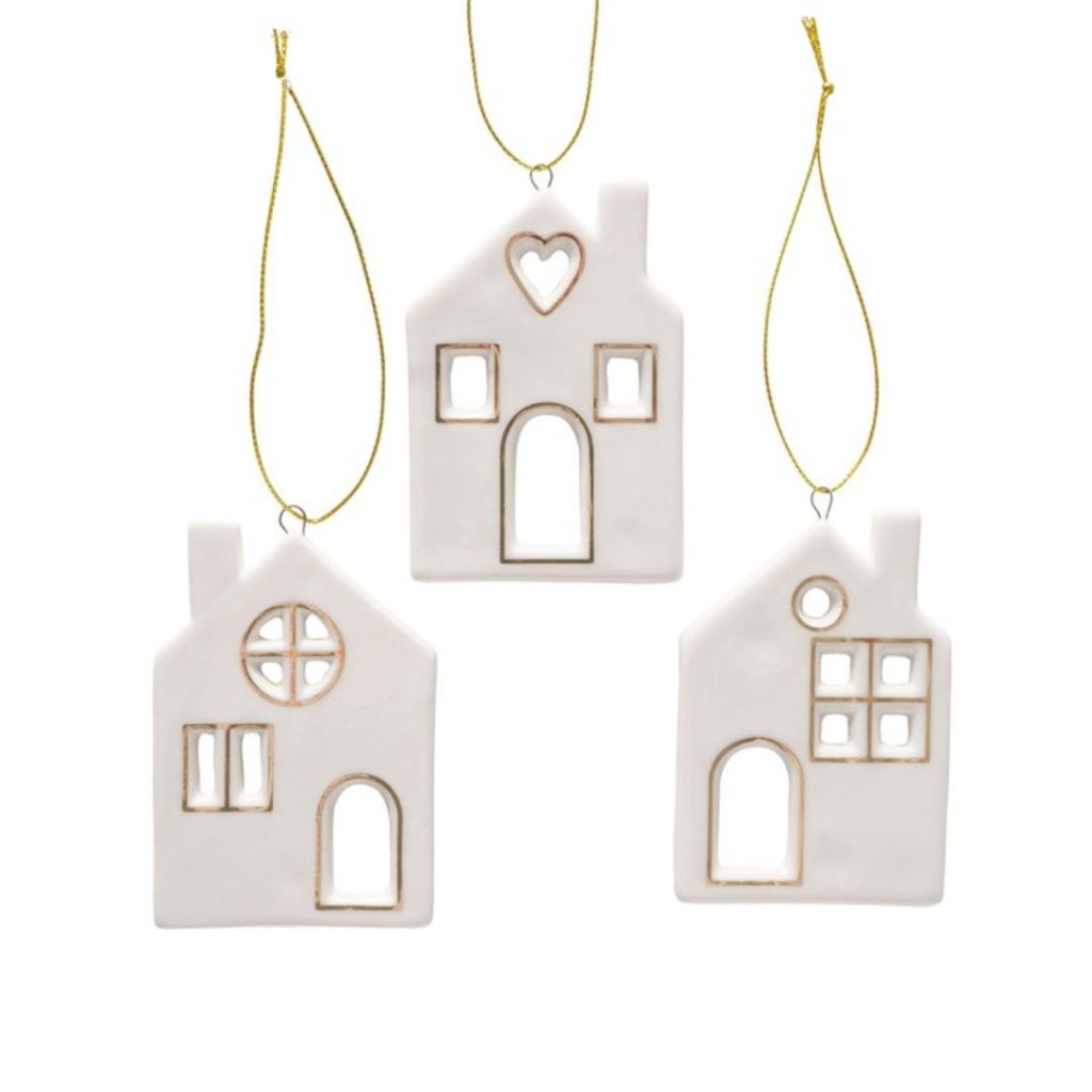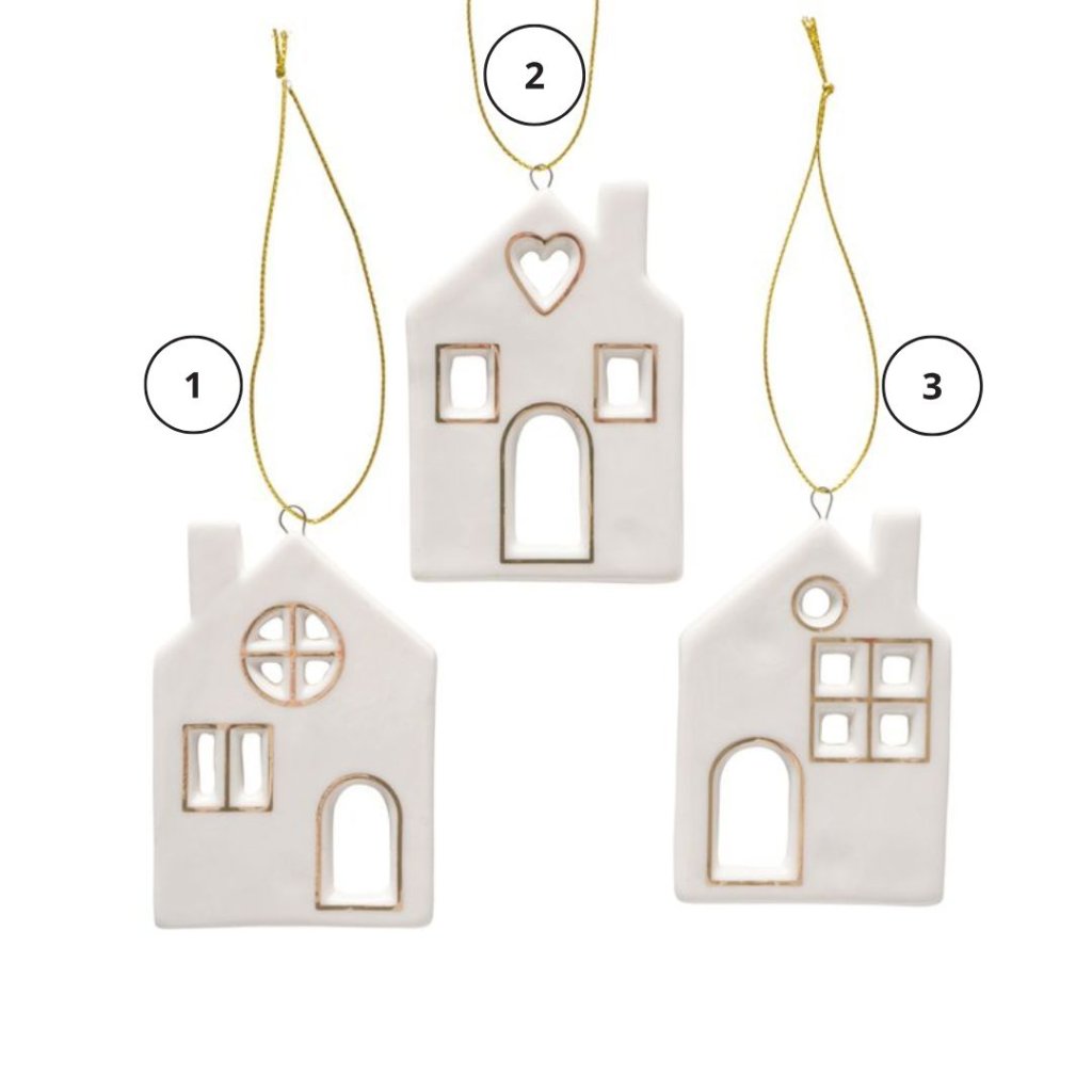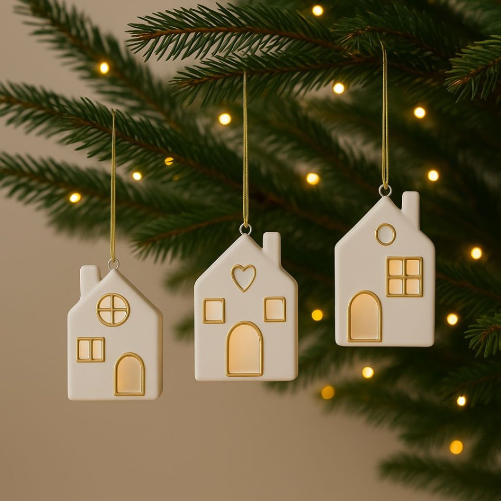 - Každý domeček je zavěšen na zlaté šňůrce, takže jsou ideální k pověšení na vánoční stromeček, do oken nebo jako součást sváteční dekorace.