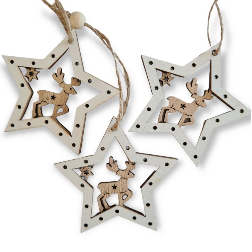 Závěsná dřevěná hvězda s jelenem o velikosti 7 cm bude zdobit váš krásný stromek nebo lze použít k tvoření vánočního stolu.Balení obsahuje 3 kusy.
