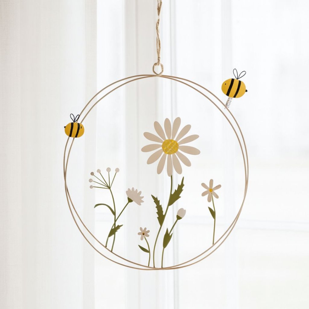 - Jako malý kousek rozkvetlé louky, který si můžete pověsit přímo do svého okna. Jemné kvítky a roztomilé včelky vám vykouzlí úsměv na tváři pokaždé, když kolem ní projdete. Skvěle doladí jarní i letní výzdobu, ale klidně vám může dělat radost celý rok – protože trocha slunce a něhy se hodí vždycky.