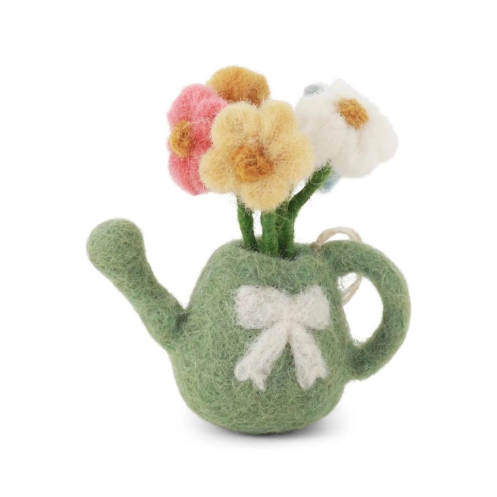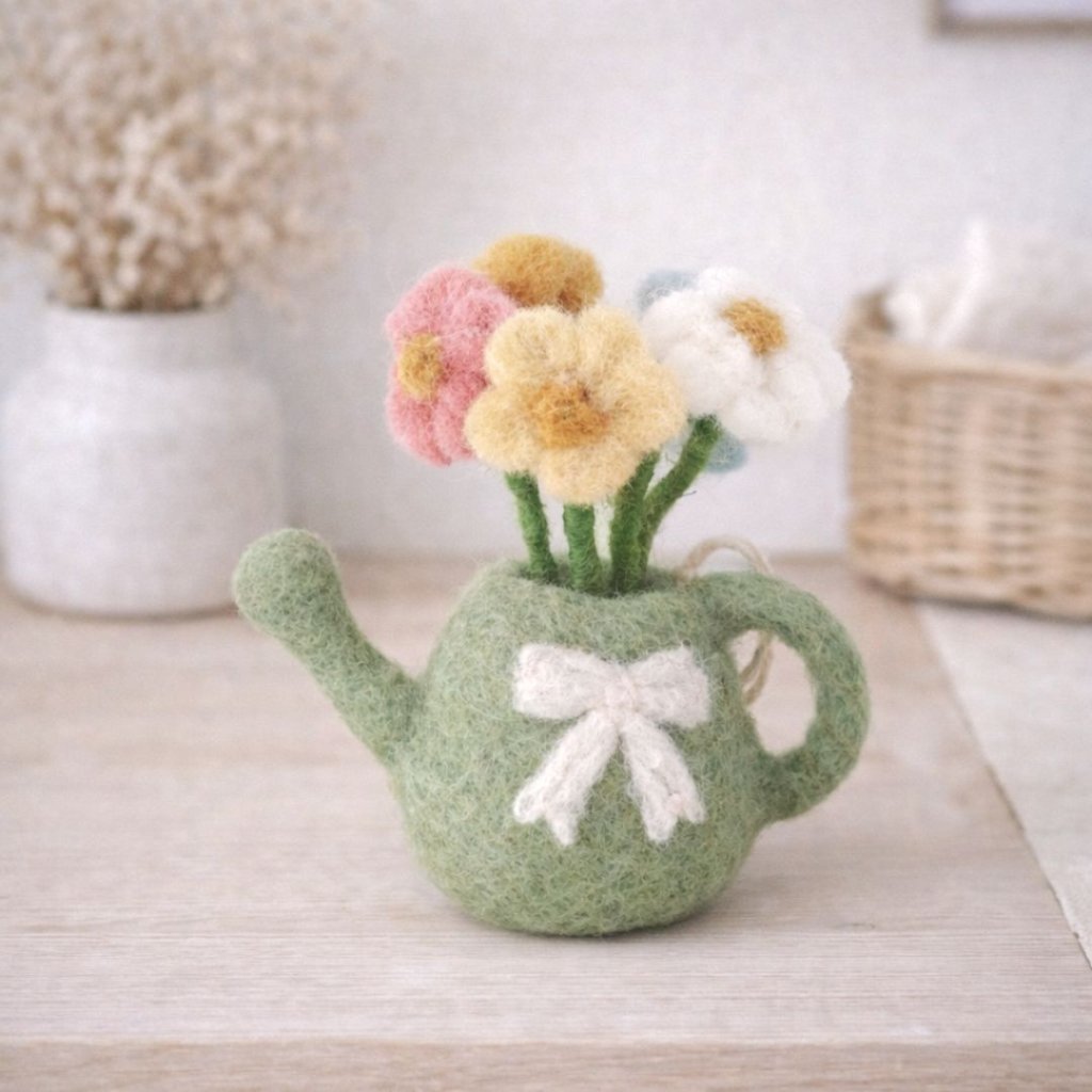 - Plstěná konvička v tlumeném zeleném odstínu je doplněna drobnou mašlí a jednoduchými květy v jemných pastelových barvách, které působí lehce a harmonicky.