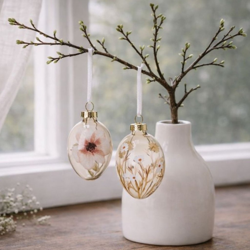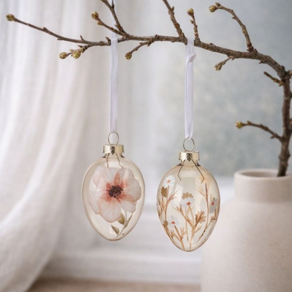 Skleněná závěsná vajíčka s květinovým motivem působí křehce, klidně a velmi přirozeně. Každý detail je laděný s citem – průsvitné sklo, měkké tóny květů a decentní stužka vytvářejí harmonii, která doma vykouzlí tichou sváteční atmosféru. - Krásně vyniknou zavěšená na jarní větvičce, v okně i jako drobný akcent v jednoduché dekoraci. Jsou ideální volbou pro ty, kdo mají rádi jemný styl a nadčasové detaily bez zbytečné okázalosti.