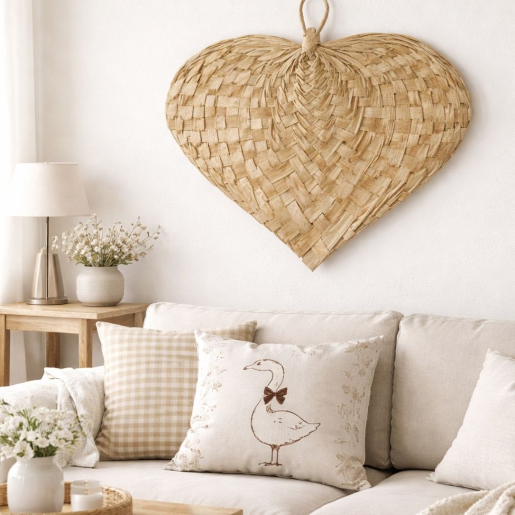 - Přírodní palmové závěsné srdce je výraznou, ale zároveň jemnou dekorací, která vnese do interiéru klid, teplo a přírodní harmonii.