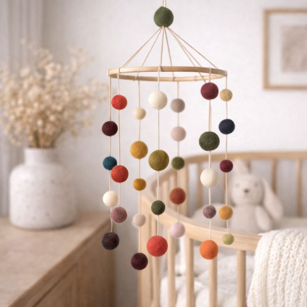 - Barevné plstěné kuličky v tlumených přírodních tónech se lehce pohupují a přirozeně upoutají pozornost miminka, aniž by působily rušivě.