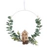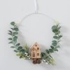 - Kovový kruh na zavěšení, který je ozdoben eukalyptusem a roztomilým domečkem je krásná sváteční dekorace nejen na dveře,ale uplatnění jistě najde i na stěne kde vám bude při rozsvícení dělat velkou parádu a jistě potěší i děti.