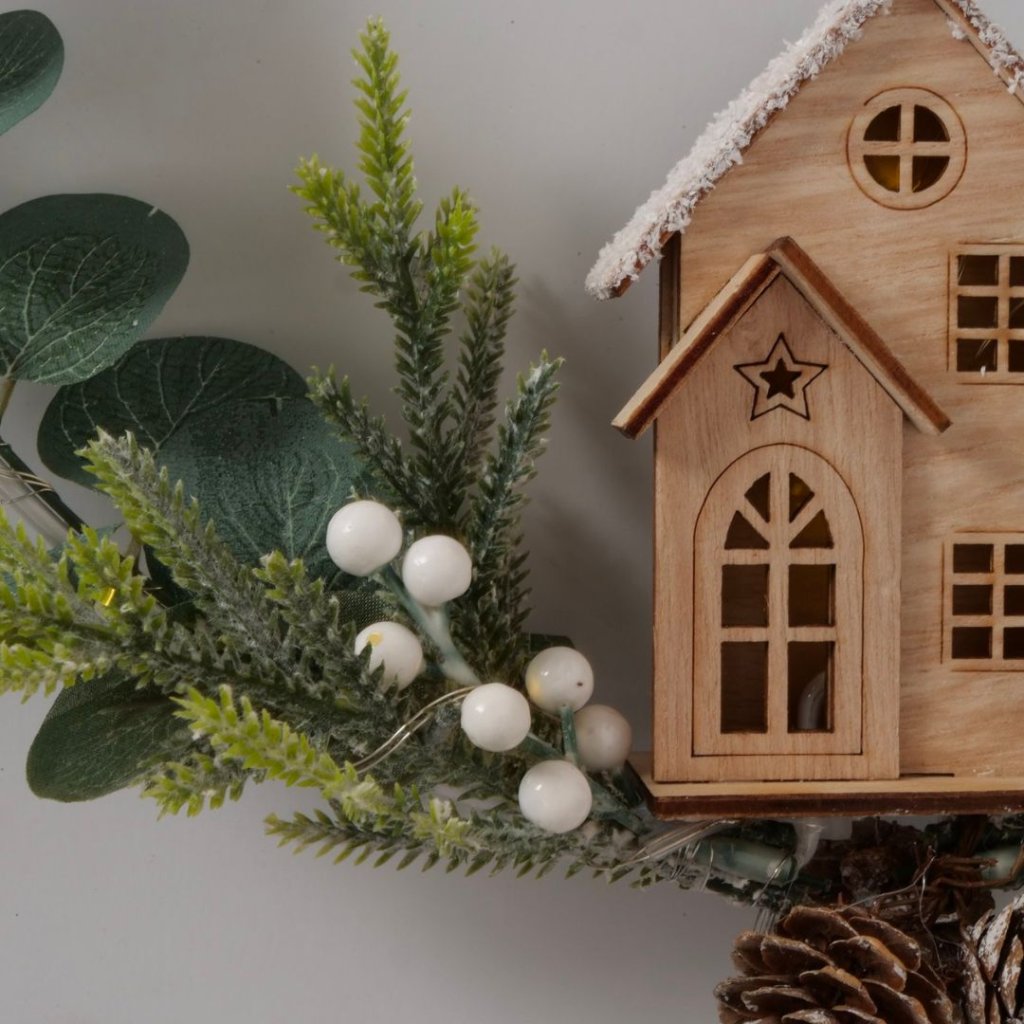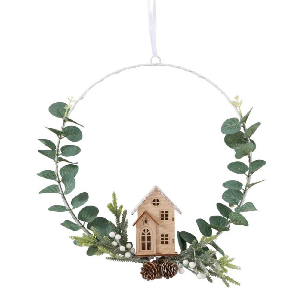 - Kovový kruh na zavěšení, který je ozdoben eukalyptusem a roztomilým domečkem je krásná sváteční dekorace nejen na dveře,ale uplatnění jistě najde i na stěne kde vám bude při rozsvícení dělat velkou parádu a jistě potěší i děti.