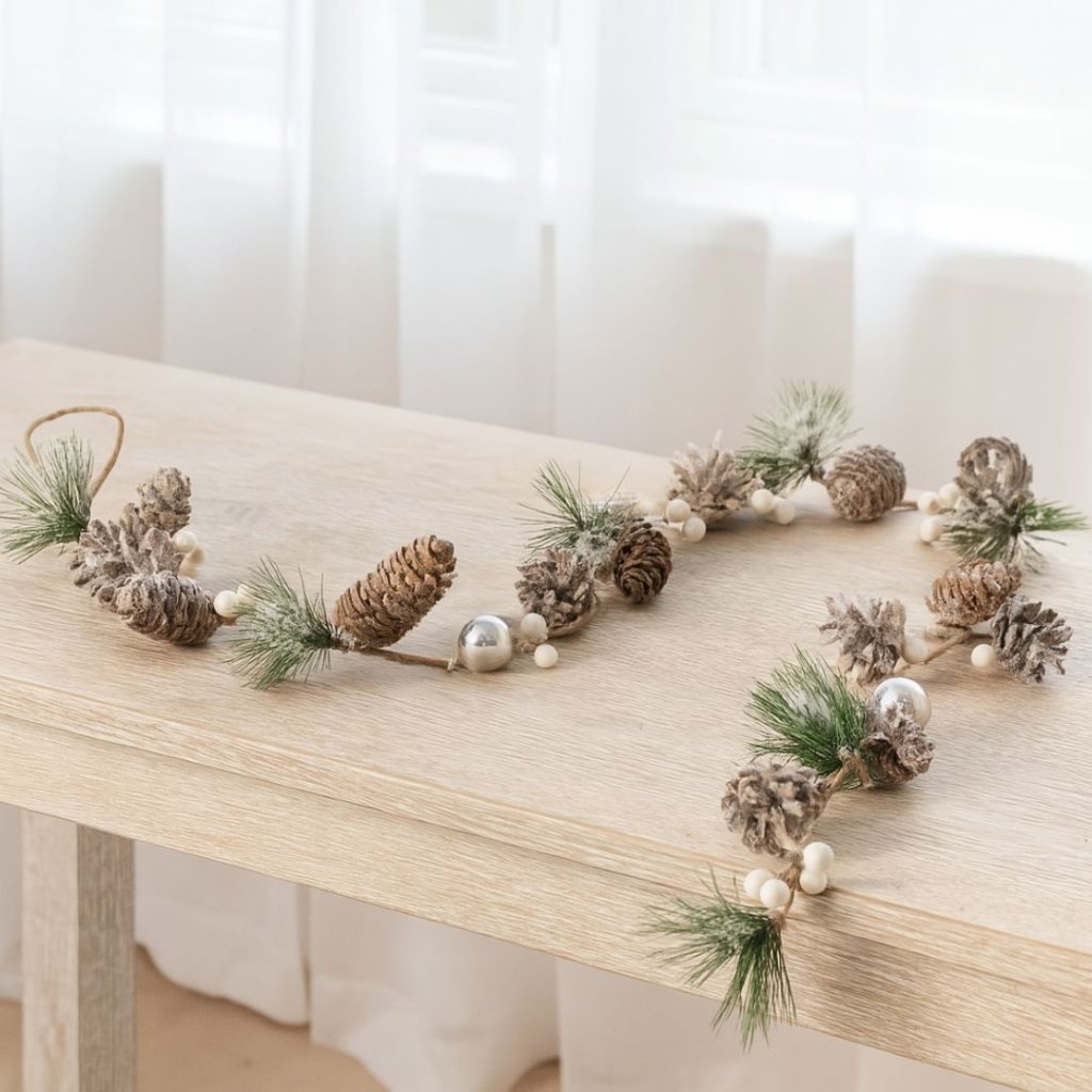 - Přírodní vánoční girlanda s bohatým dekorem šišek, umělého jehličí, bílých bobulek a stříbrných ozdobiček je ideální pro sváteční výzdobu interiéru.